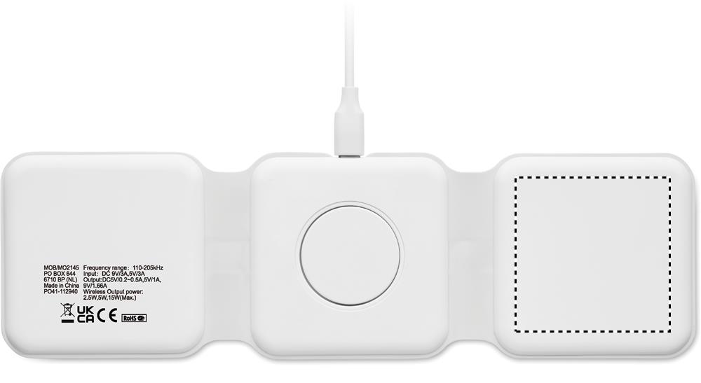 Zusammenfaltbare Ladestation 3in1. ABS. Sie verfügt über 3 kabellose Ladepunkte. Eingang: 2-in-1 Typ-C und Typ-A. 15 W. Kompatibel mit allen QI-fähigen Geräten wie den neuesten Android Smartphones, iPhone® 8 und X und höher. Auch kompatibel mit der iWatch.