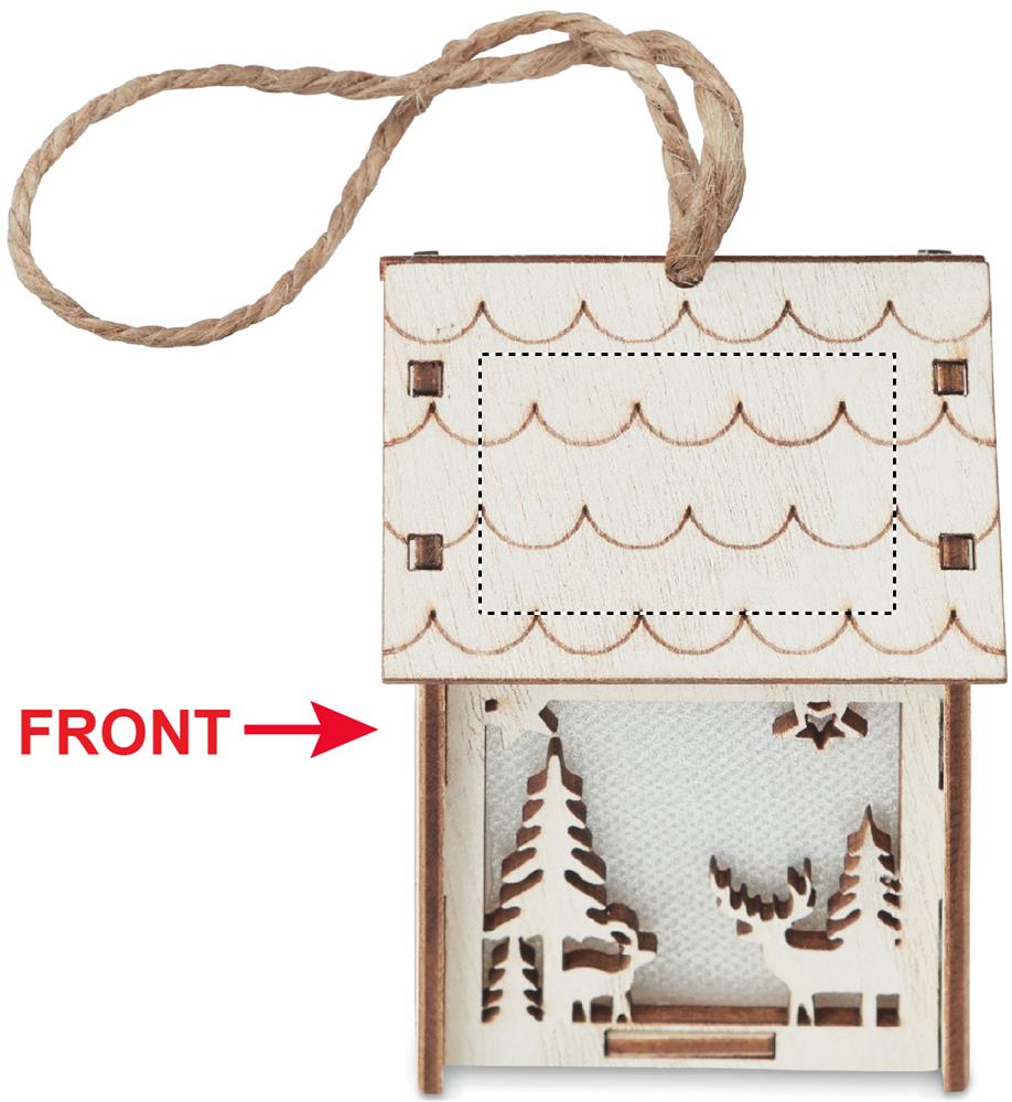 Anhänger im Form eines Hauses mit weihnachtlichen Ornamenten. Mit Innenbeleuchtung und Aufhänger aus Kordel. MDF. Inkl. 3 AG10 Batterien.