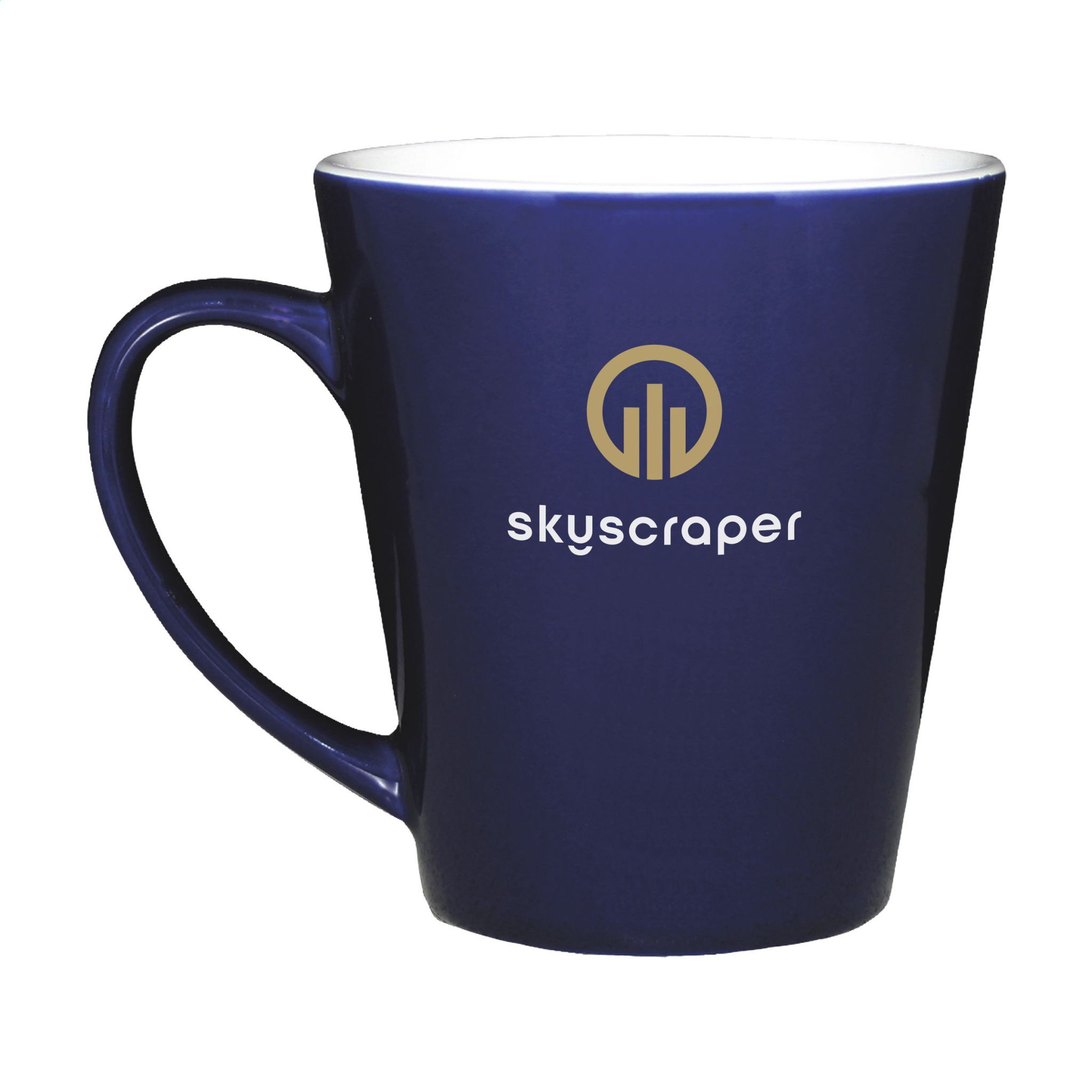 Zeitgenössische, hochwertige Keramiktasse. Ganz in Weiß oder mit farbiger Außenseite. Spülmaschinenfest. Fassungsvermögen 310 ml. Der Aufdruck ist spülmaschinenfest und zertifiziert: EN 12875-2.