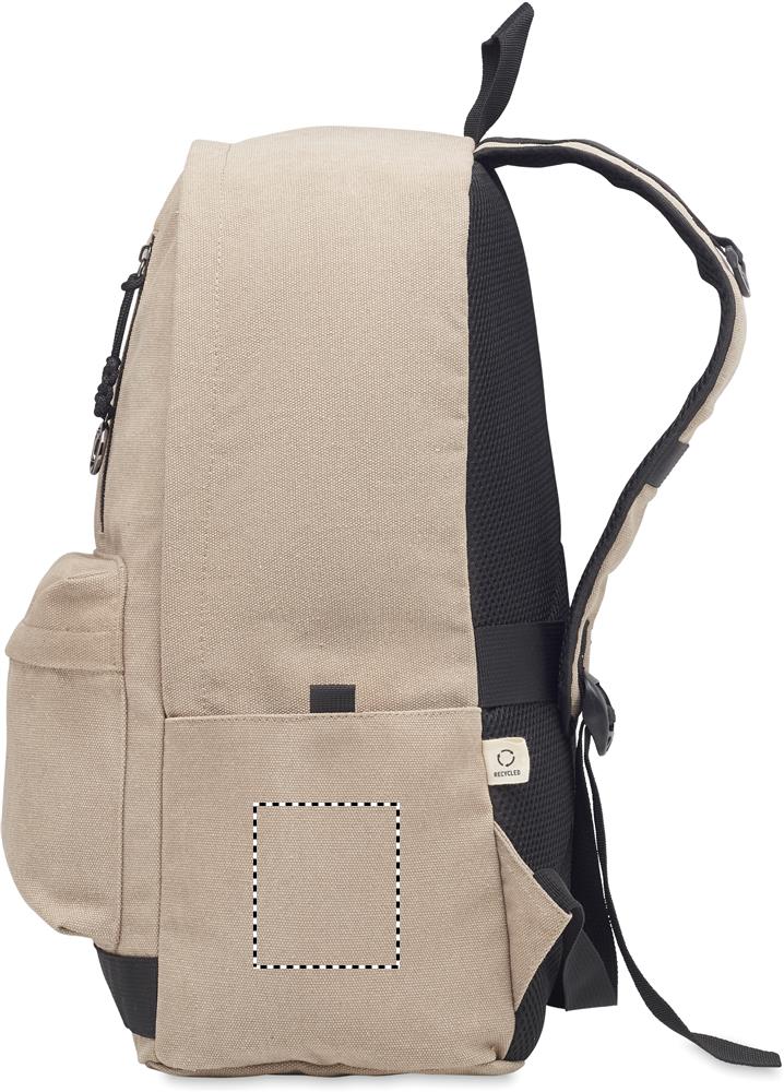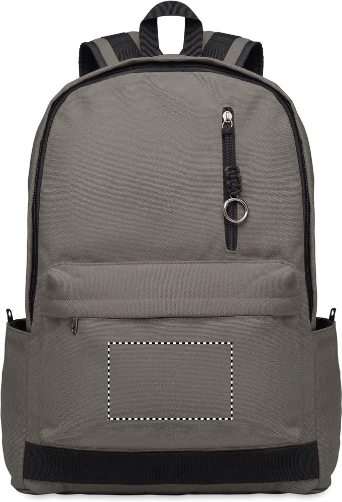 15" Laptop-Rucksack aus recycelter Pre-Consumer-Baumwolle. Große Fronttasche mit Reißverschluss und Laptop-Innenfach. Kleine Fronttasche mit Reißverschluss. Zwei seitliche Steckfächer. Rückseite, Boden und Schultergurte gepolstert. 450 g/m².