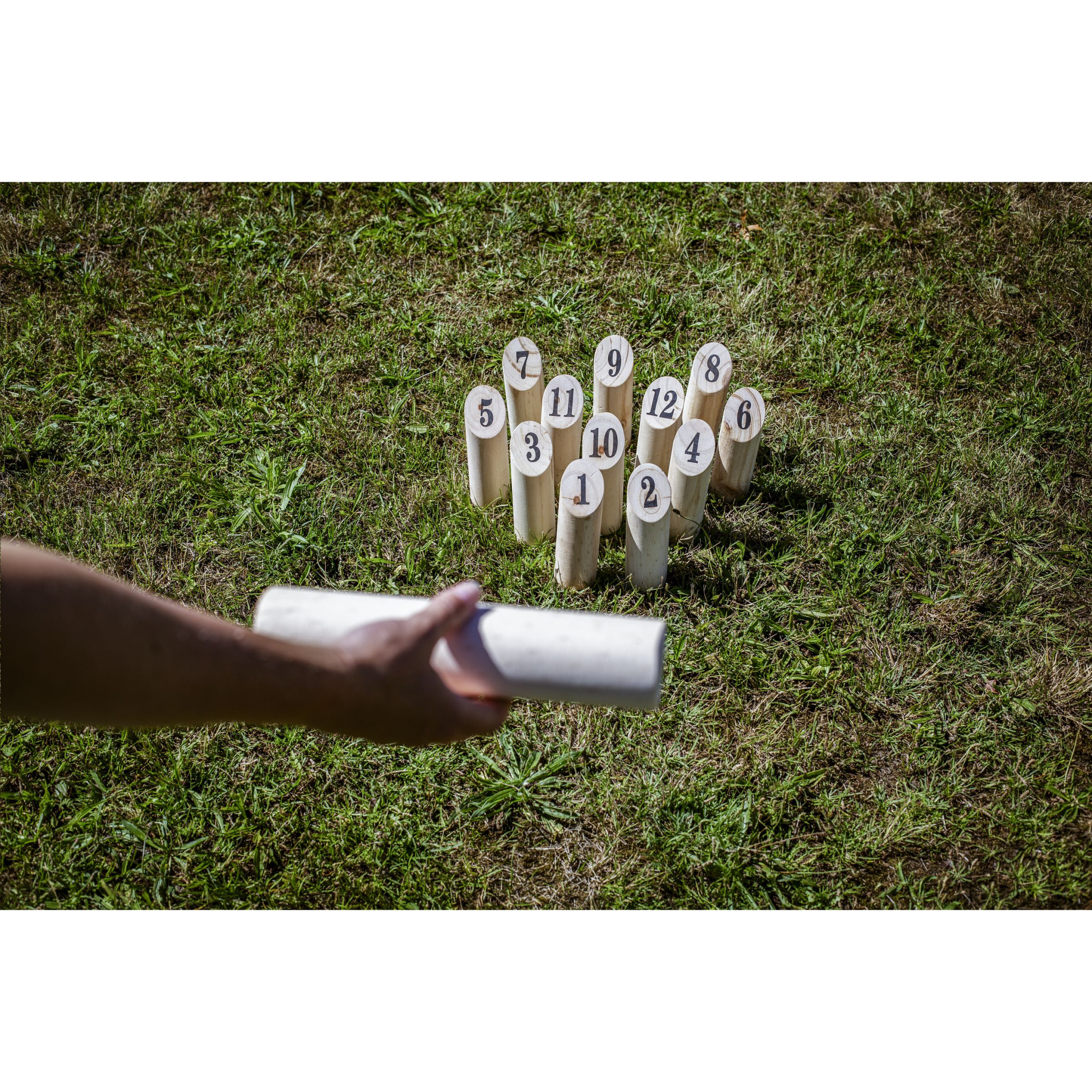 Wurfspiel aus Holz, auch Finnenkegeln genannt. Wer erreicht als Erster die geforderten 50 Punkte? Bei diesem finnischen Outdoor-Partyspiel sind Geschick, Präzision und Strategie gefragt. Spielspaß auf dem Campingplatz oder am Strand. Für große und kleine Spieler geeignet. Das 13-teilige Set wird in einem Baumwollbeutel geliefert. Inkl. Spielanleitung. Die Lieferung erfolgt einzeln in einem braunen Karton.