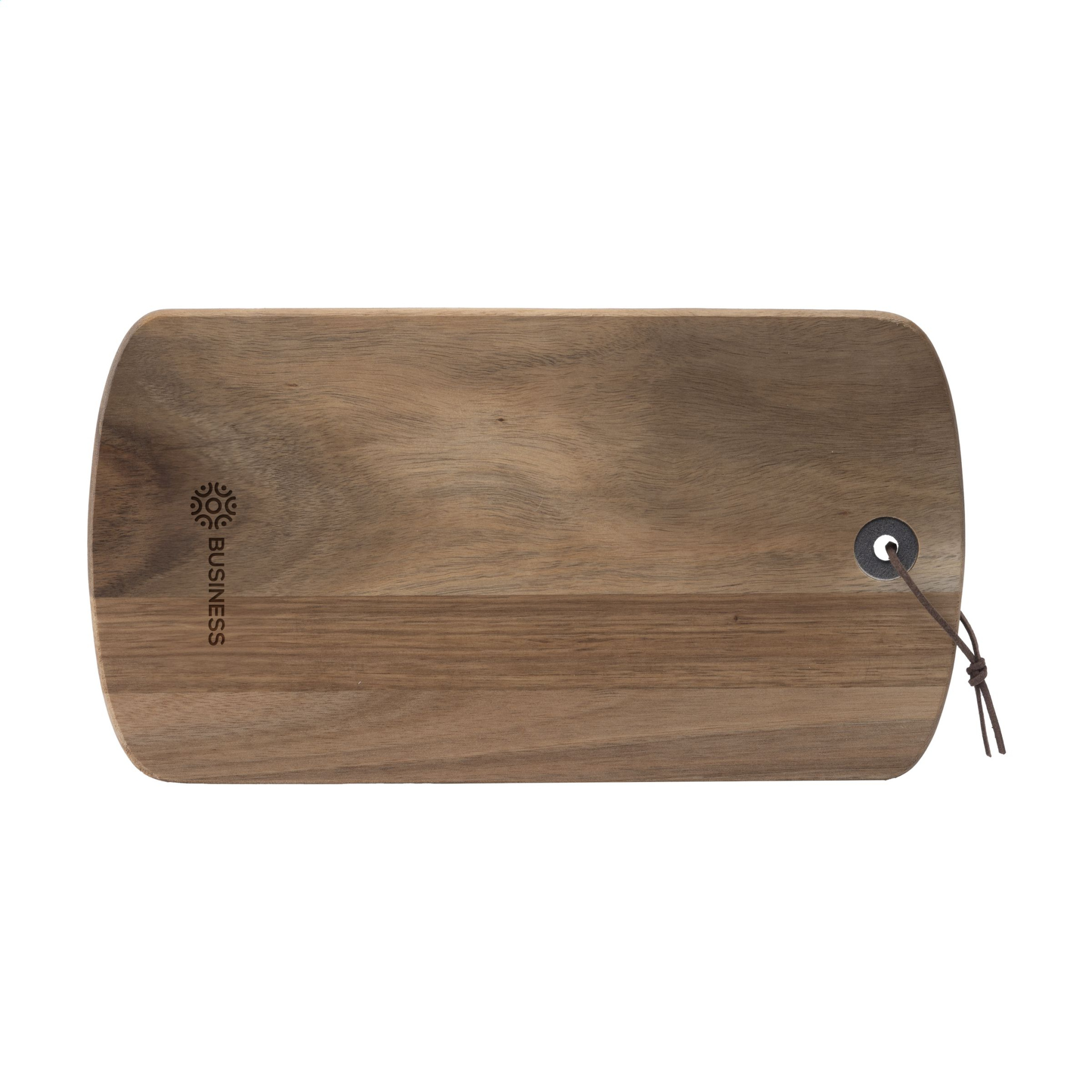 Käsebrett aus Akazienholz, einer robusten Holzart mit warmer Ausstrahlung. Mit Lederkordel. Inklusive 2 Käsemessern und 1 Käsegabel. Ein schönes Set zum Servieren verschiedener Käsesorten. Jedes Set wird mit einer Kartonhülle geliefert.