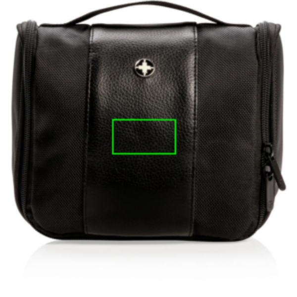 1680D Polyester Kulturbeutel mit einem Hauptfach mit 4 Fächern, 2 offenen Netztaschen und einer Netztasche mit Reißverschluss im Inneren. Inkl. Haken zum einfachen Aufhängen.