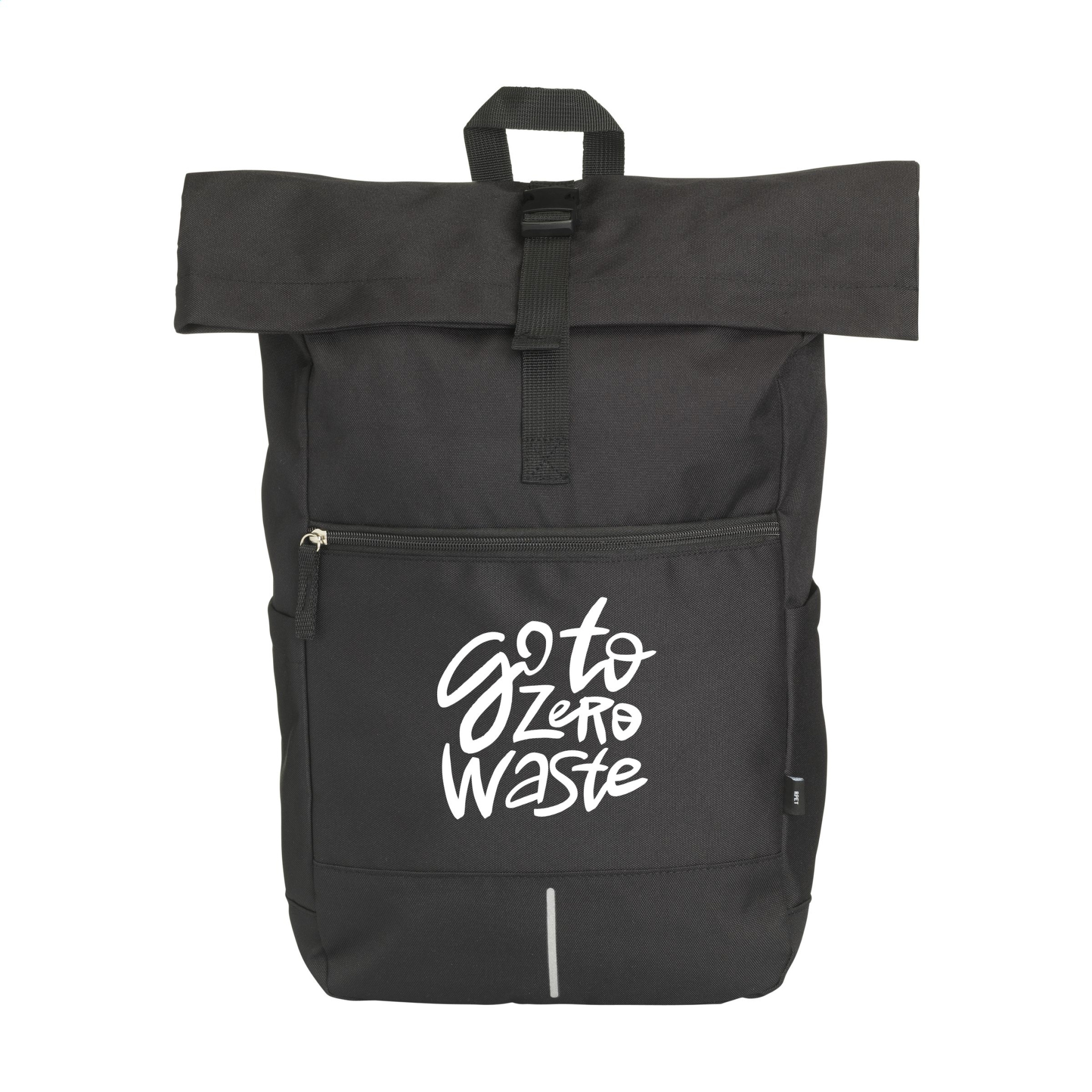 WoW! Praktischer, robuster und wasserabweisender urbaner Rolltop-Rucksack aus RPET-Polyester (hergestellt aus recycelten PET-Flaschen). Der Rucksack verfügt über ein großes Innenfach mit speziellem Laptopfach (bis 15,6“). Reißverschlusstasche auf der Vorderseite mit reflektierender Markierung darunter (verbessert die Sichtbarkeit im Dunkeln). Mit 2 Seitentaschen, Schaumstoffrücken und gepolsterten, verstellbaren Schultergurten für erhöhten Tragekomfort, Tragegurt und praktischem Rollverschluss mit Klicksystem an der Oberseite. Fassungsvermögen ca. 20 Liter.