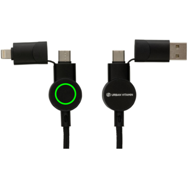 Das Gehäuse des Schnellladekabels Oakland besteht aus 100% RCS-zertifiziert recyceltem TPE & Aluminium, das Kabel aus 100% recyceltem TPE-Innen und 100% recycelter PET-Außenschicht. RCS (Recycled Claim Standard) ist ein Standard zur Überprüfung des Recyclinganteils eines Produkts in der gesamten Lieferkette. Dieser Standard wird verwendet, wenn ein Teil des Artikels aus recycelten Materialien hergestellt wurde. 120cm langes Kabel mit 5 verschiedenen Anschlüssen: USB-C In,USB-A In,Typ-C Out,IOS Out und Micro USB Out. Daher auch mit Typ-C Ausgabegeräten verwendbar, wie z.B. neueren Generation von Telefonen und MacBook-Computern. Die USB-A-In/Out-Option sorgt dafür, dass man jedes Gerät von jeder Ausgangsquelle aufladen kann. Maximale Spannung von Typ-C zu Typ-C sind 45W. Urban Vitamin Artikel werden ohne PVC hergestellt. Die Verpackung mit besonders wenig Kunststoff verpackt. Gesamter Recyclinganteil: 52% bezogen auf das Gesamtgewicht des Artikels. Kann Laden und Synchronisieren.