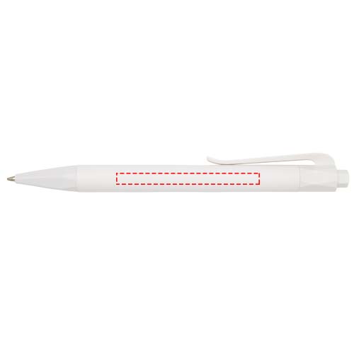 Langlebiger und nachfüllbarer Kugelschreiber mit Klick-Mechanismus aus 100 % PLA (Getreide Kunststoff), der die Menge des verwendeten Kunststoffs reduziert. Beinhaltet eine blaue Mine mit einer Schreiblänge von ca. 2000 Metern. Verpackt in einer Stifthülle aus Karton.