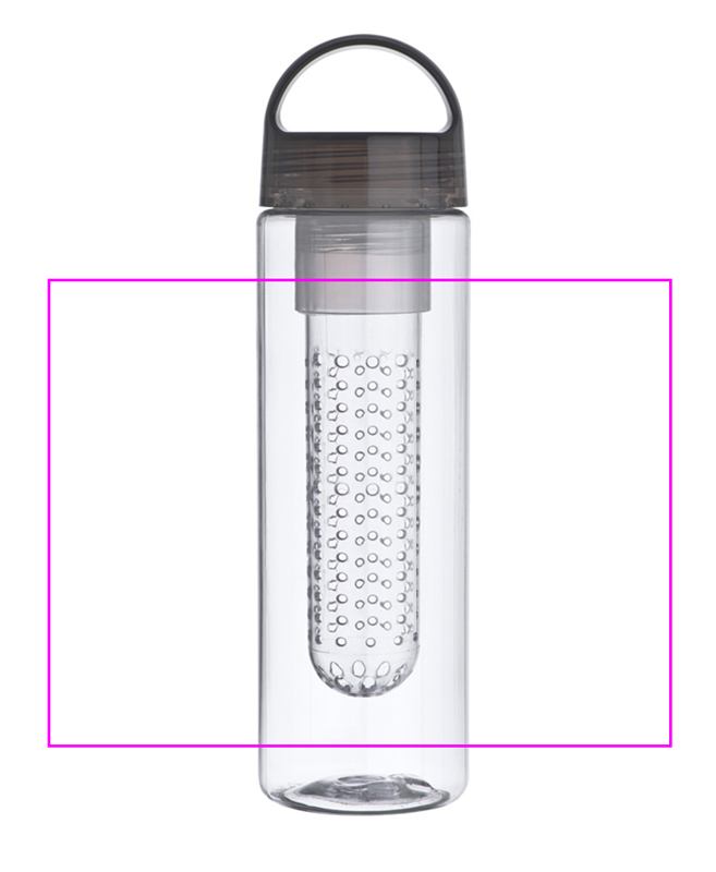 Trinkflasche aus Kunststoff mit Sieb für z.B. Früchte und 650ml Fassungsvermögen. Ihre Werbung drucken wir auf die Flasche.