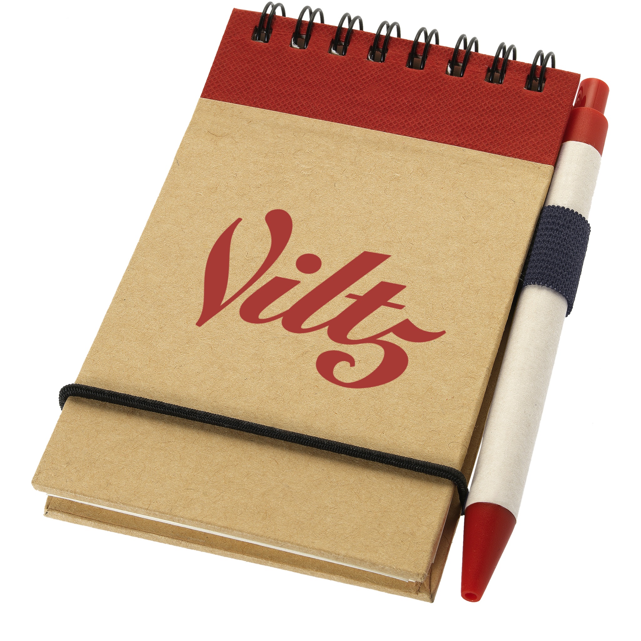 Mit dem Zuse Recycling-Notizblock mit farblich passendem Stift lassen sich schnell Ideen notieren. Der kleine Notizblock enthält 40 linierte Blätter aus A7 Recyclingpapier, passt also in jede kleine oder große Tasche, liegt gut in der Hand und ist vor allem nachhaltig. Verschiedene Druckoptionen stehen zur Verfügung, um ein beliebiges Logo auf der Außenseite des Hardcovers anzubringen.