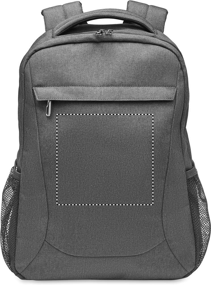 15 inch laptop backpack in 600D RPET polyester. Internal laptop compartment and several small inner compartments. It has a front zippered pocket and 2 side mesh pockets. Adjustable shoulder straps. Trolley holder on reverse side.
