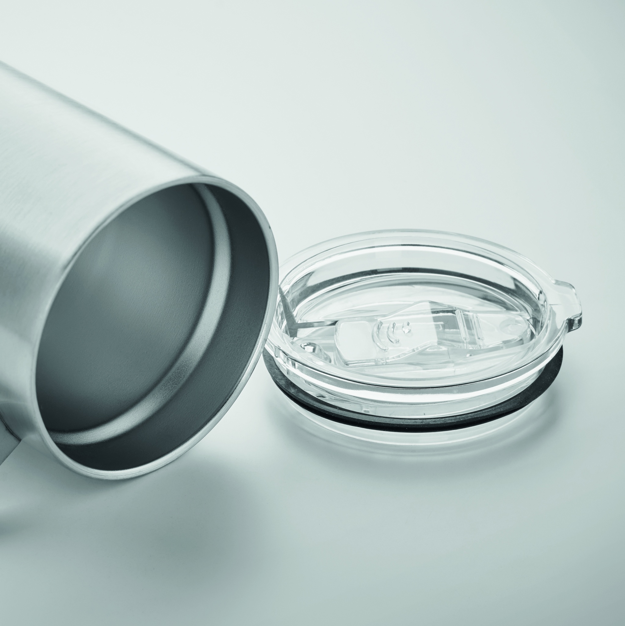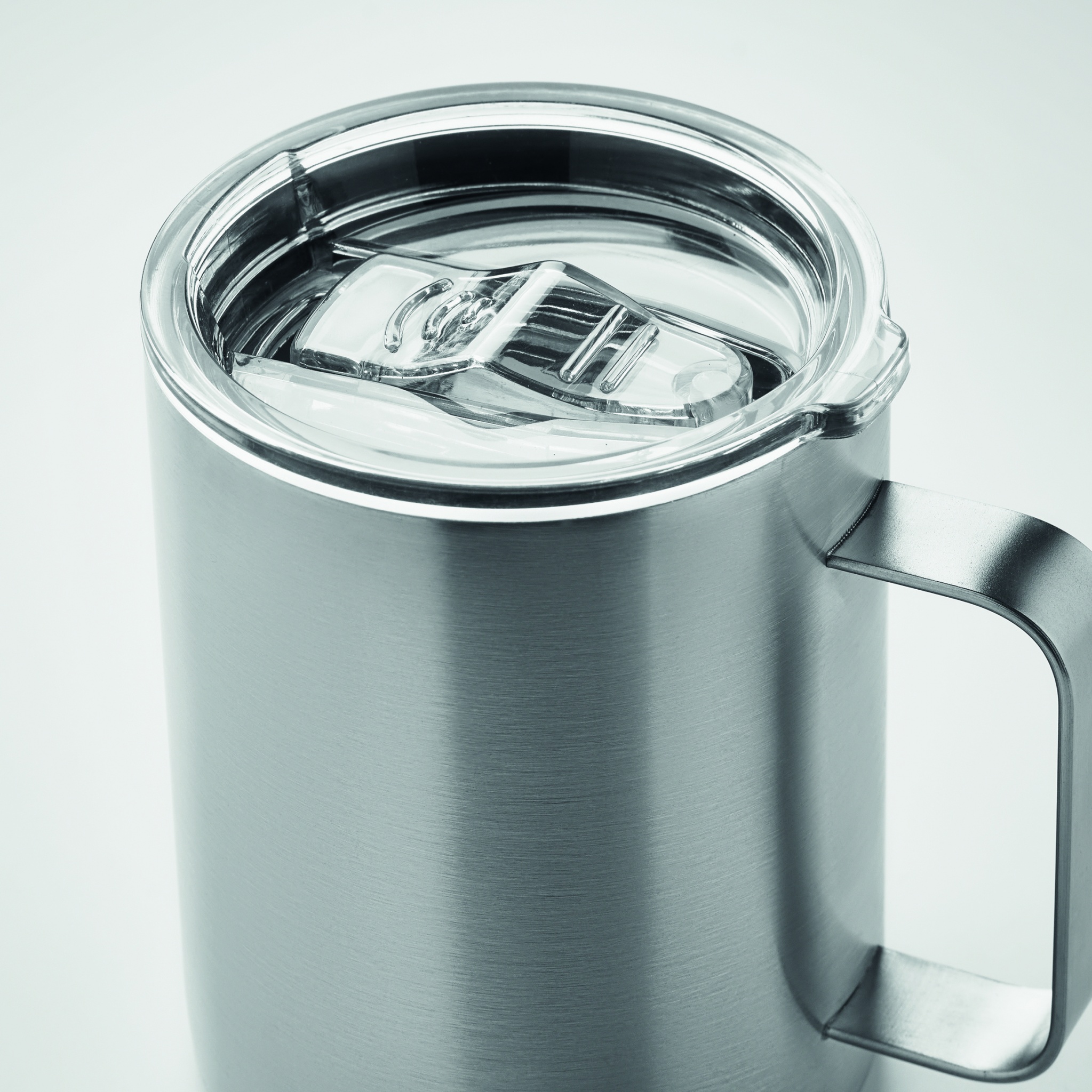 Double wall recycled stainless steel (90% recycled stainless and 10% stainless steel) mug with sliding sip hole cover. Capacity: 300 ml.