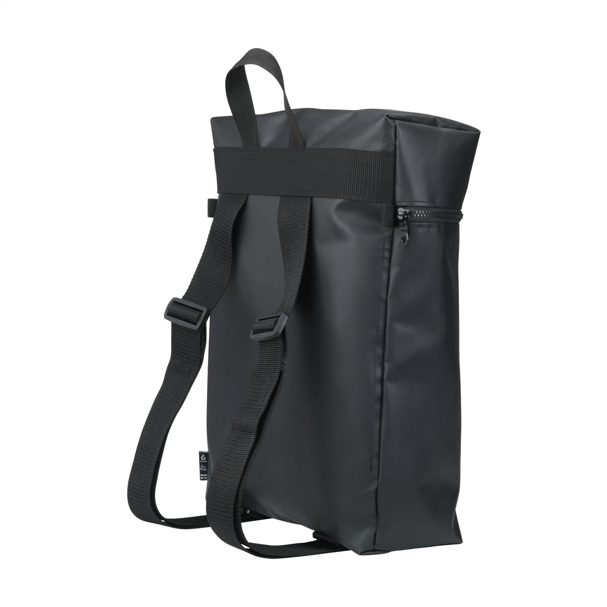 Tough backpack from the Fraenck brand, made from upcycled sailcloth. The sturdy and water-repellent material comes from upcycled leftover materials from the sail-making industry. The roll top closure has a zip, can be rolled up and secured with a carabiner. With adjustable shoulder straps and a carrying loop. A timeless design. Capacity approx. 16 litres. Made in Holland.
