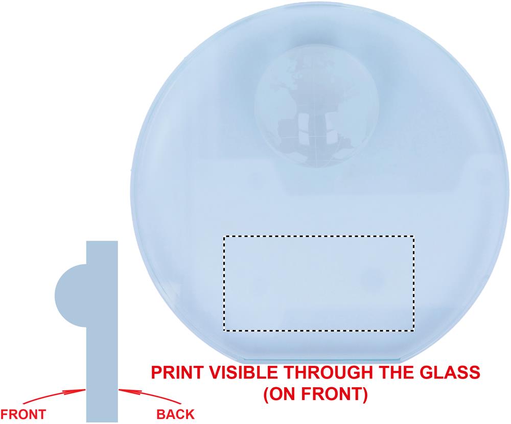 Elegant round trophy made in glass, featuring a relief half globe pattern on top. Presented in a classic gift box.