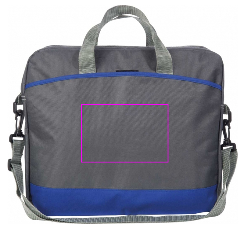 Gray laptop bag with bright colored accents, spacious interior compartment, and front compartment, on which we will print your logo.