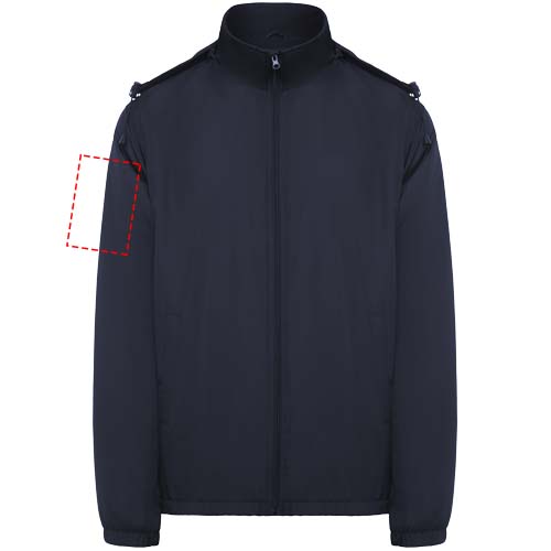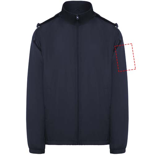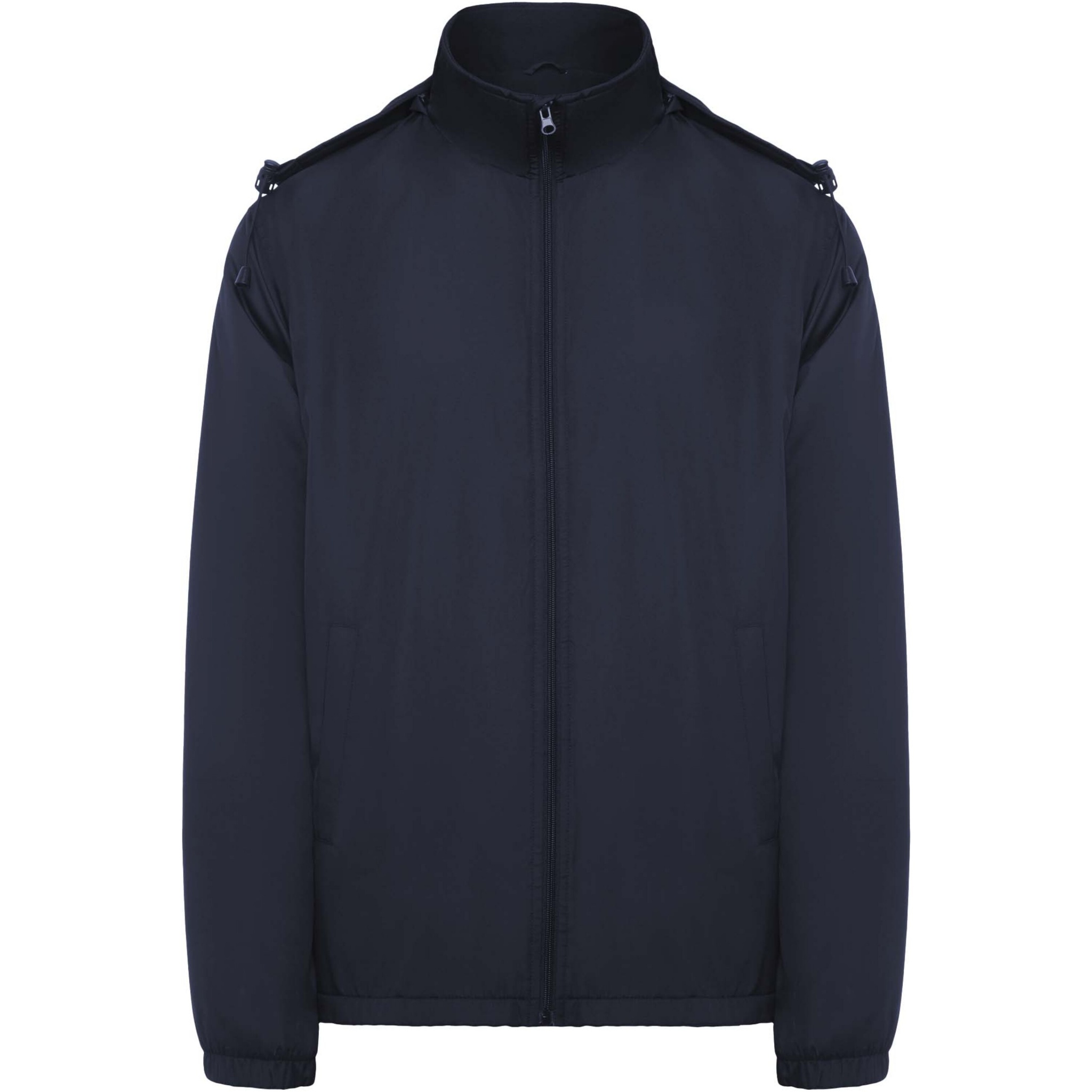Light waterproof jacket. High collar and foldable hood with adjusters. Microfleece lining. Front zip and chin protector. Elastic cuffs. Two side pockets with zip. Interior left chest pocket. Removable label. Waterproof. Wind-proof. The male model is 184 cm and is wearing size L, and the female model is 174 cm and is wearing size S.