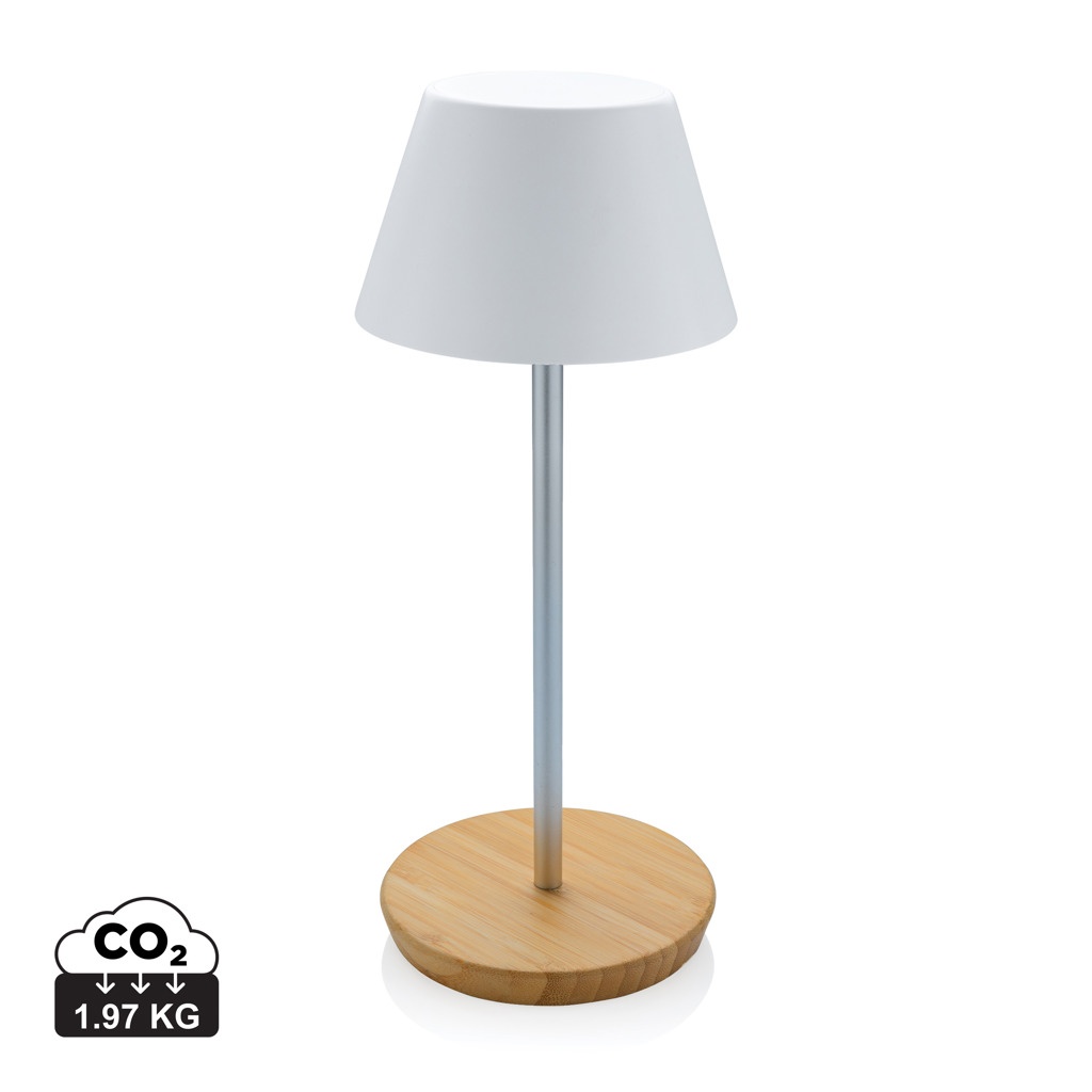 Luxury table lamp made with RCS certified recycled ABS plastic, recycled aluminum and FSC certified 100% bamboo . Total recycled content: 40% based on total item weight. RCS certification ensures a completely certified supply chain of the recycled materials. The table lamp will operate up 18 hours on one single charge and can be re-charged in 2 hours. With a-grade 1800 mAh battery and type C input ( 5V/1A) With two modes (warm light and white light) that can be adjusted by touch sensor in the base. Rechargeable via USB-C. Packed in FSC® mix packaging. IPX 4 waterproof.