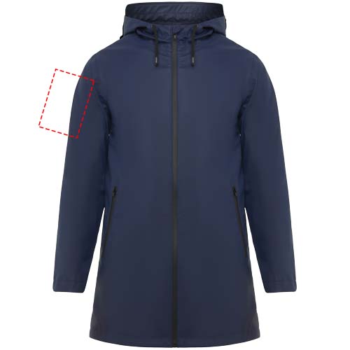 Waterproof raincoat. Hood with peak. Heat-sealed zips and seams. Contrasting details in black. Two side pockets with zip. Slit on back hem. Removable label. Waterproof. The model is 185 cm and is wearing size M.