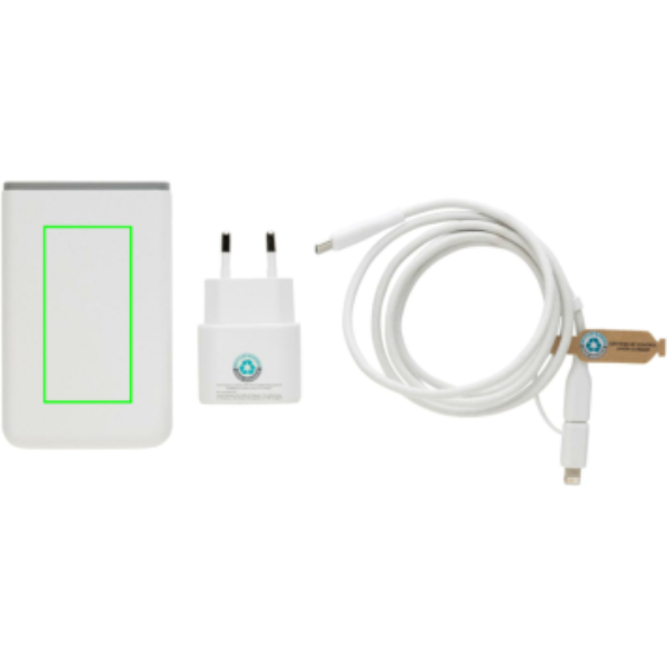 3 pcs 20W fast charging set for mobile devices and other small devices. With EU adapter with 20W USB C port, 5000 mAh powerbank and 120cm recycled TPE 60W fast charging cable (USB C to USB /Lightning). The cable supports data transfer and also charging of larger devices like laptops. Adapter, powerbank and cable made from RCS certified recycled PC, ABS and recycled TPE. Packed in pouch made from RCS certified recycled PET. Total recycled content of whole set: 59% based on total item weight. RCS certification ensures a completely certified supply chain of the recycled materials. Packed in FSC® packaging. PVC Free. Input wall charger AC 100-240V 50/60Hz 0.6A; Output wall charger USB-C :5.0V⎓3.0A,9.0V⎓2.22,12.0V⎓1.67A (20W Max). Output powerbank 5V⎓2.4A -USB-C Input: 5V⎓2.4A
