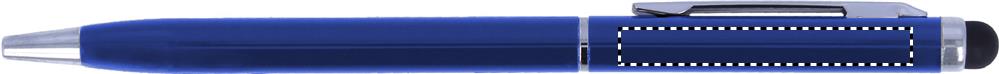 Twist action ball pen in aluminium with stylus and shiny chrome clip. Blue ink.