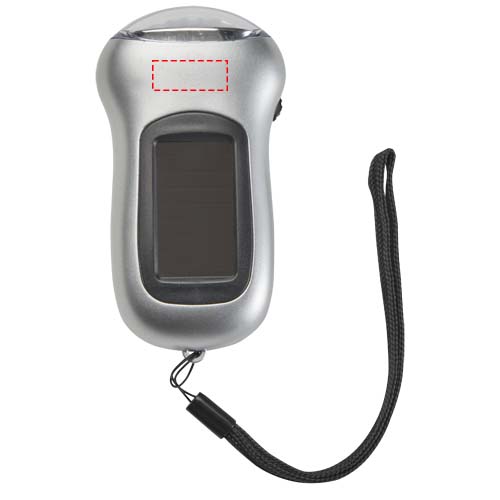 Compact solar torch with a brightness of 10.000 mcd. The torch can also be powered manually by turning the handle.