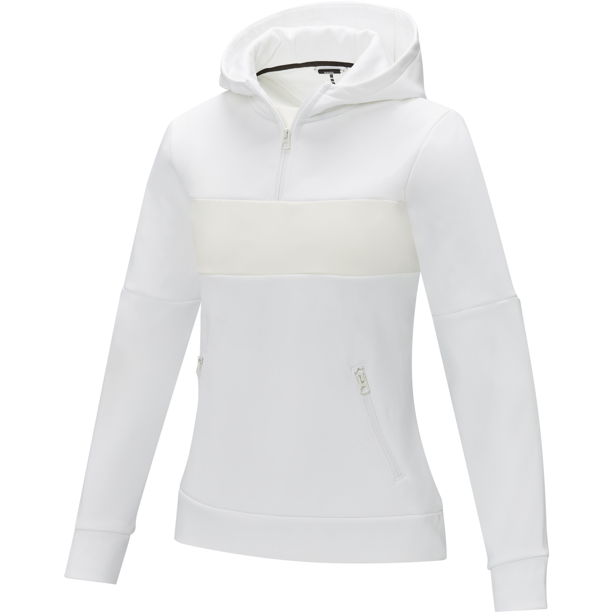 Naiste pooleldi lukuga anorak kapuutsiga sviiter Sayan – ainulaadne jõudluse ja stiili kombinatsioon. Anoraki disain ühendab moe ja funktsiooni sujuvalt ning sellel on veerand tõmblukk, mis muudab kihistamise mitmekülgseks. Valmistatud 350 g/m² polüestri ja Sorona® kudumi segust. Sorona® kiud suurendab jope keskkonnasõbralikkust, sisaldades säästvat elementi jõudlust tegemata. Esipaneeli kontrastkangas, mis on valmistatud 280T ripstop nailonist, lisab disainile oma vastupidavuse ja tekstuuri ning on ideaalne koht teie kaubamärgi esitlemiseks. Olenemata sellest, kas asute väljas seiklema või lihtsalt navigeerite oma igapäevases rutiinis, ühendab Sayani kapuutsiga kampsun moe ja funktsiooni vaevata. See kampsun on kujundatud liibuva kujuga, et anda naiselik välimus.