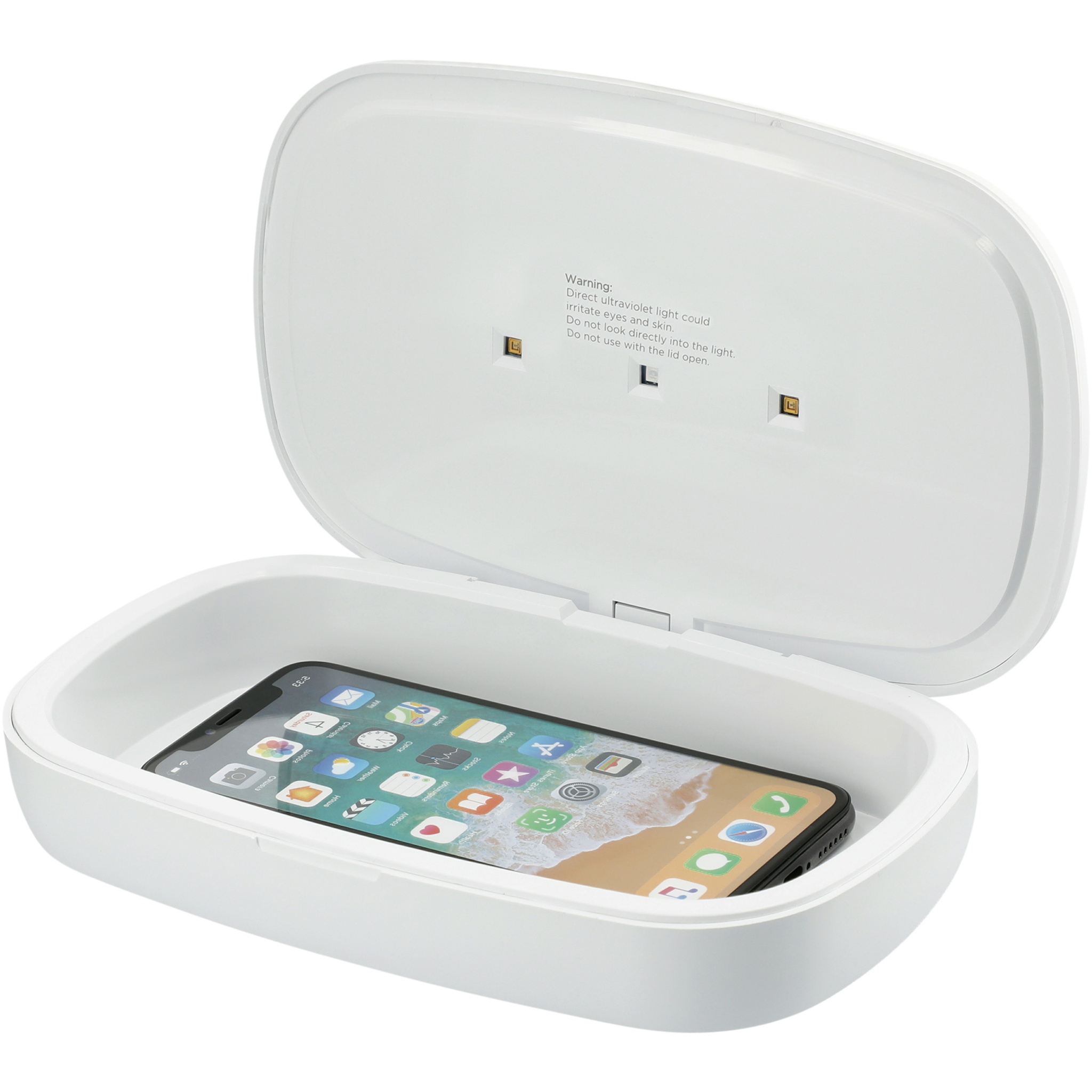 Logotrade firmakingituse foto: UV-kapsel nutitelefoni desinfitseerimisvahend koos 5 W juhtmevaba laadimispadjaga
