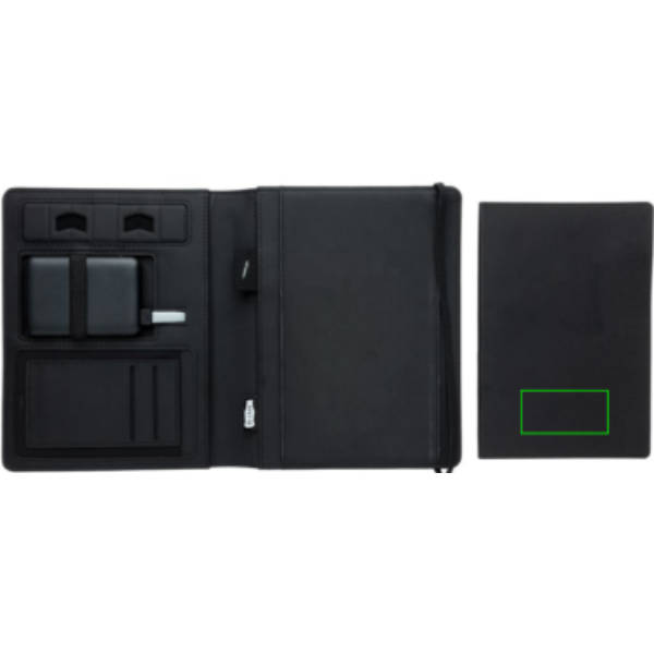 Näiden muistikirjakansien etukannessa on langaton latausalusta älypuhelintasi varten. (Androidin uusimmat sukupolvet, iPhone 8 ja uudemmat.) Vanhemmat puhelimet ja tabletit voidaan ladata USB-liitäntöjen kautta 5 000 mAh varavirtalähteen avulla. Sisääntulo: 5,0 V/2,1 A. Ulostulo 1: 5,0 V/2,1 A. Ulostulo 2: 5,0 V/2,1 A. Langaton ulostulo: 5W. Rekisteröity malli®