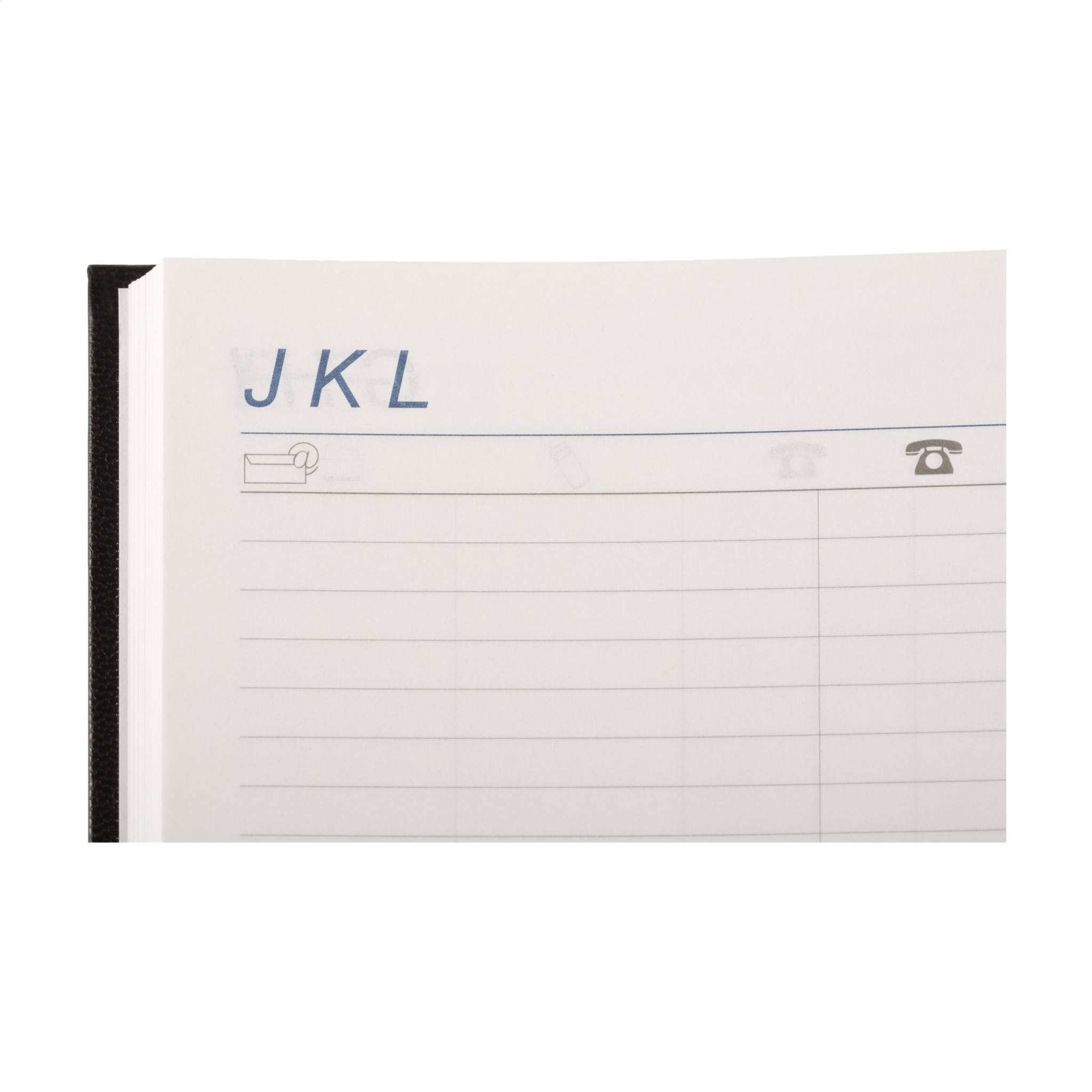 Toimistopäiväkirja neljällä kielellä: EN, NL, F ja D. Kestävä pehmustettu Balacron-kansi ja vuosiluku edessä. 80 g valkoista, FSC Mix -sertifioitua paperia, iso viikkokatsaus kahdelle sivulle, 2-väripainatus, lankasidottu, viikkokatsaus kahdelle sivulle, vuosisuunnittelija kuluva vuosi ja ensi vuosi, lisähyödyllistä tietoa. Lähes A5 kokoa.