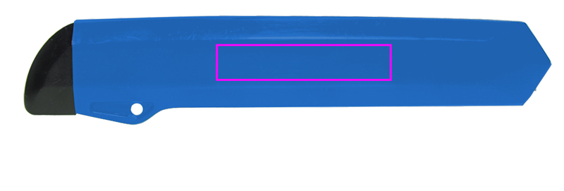Muovinen pahviveitsi irrotettavalla terällä (seitsemän teräosaa). Painamme logosi muovikotelon suljettuun osaan.