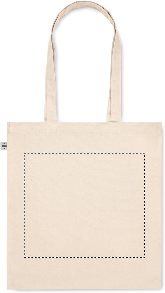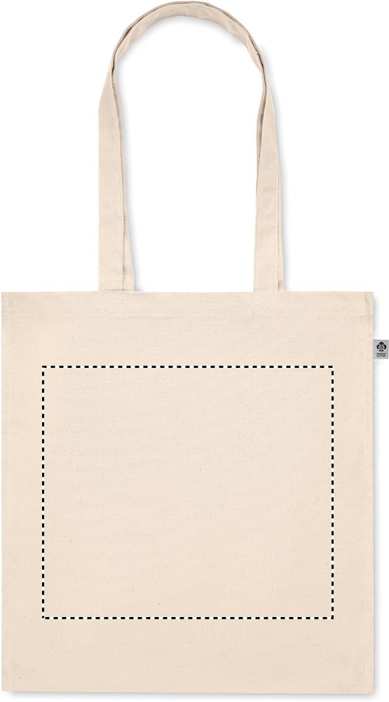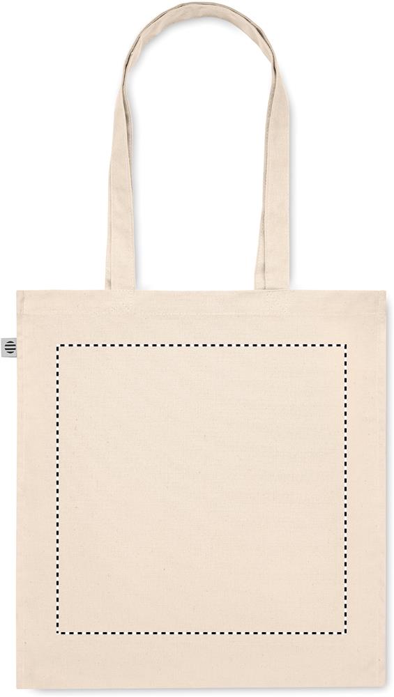 Luomupuuvillasta valmistettu ostoskassi, jossa on pitkät kahvat ja sivutaitteet. 220 gr/m².