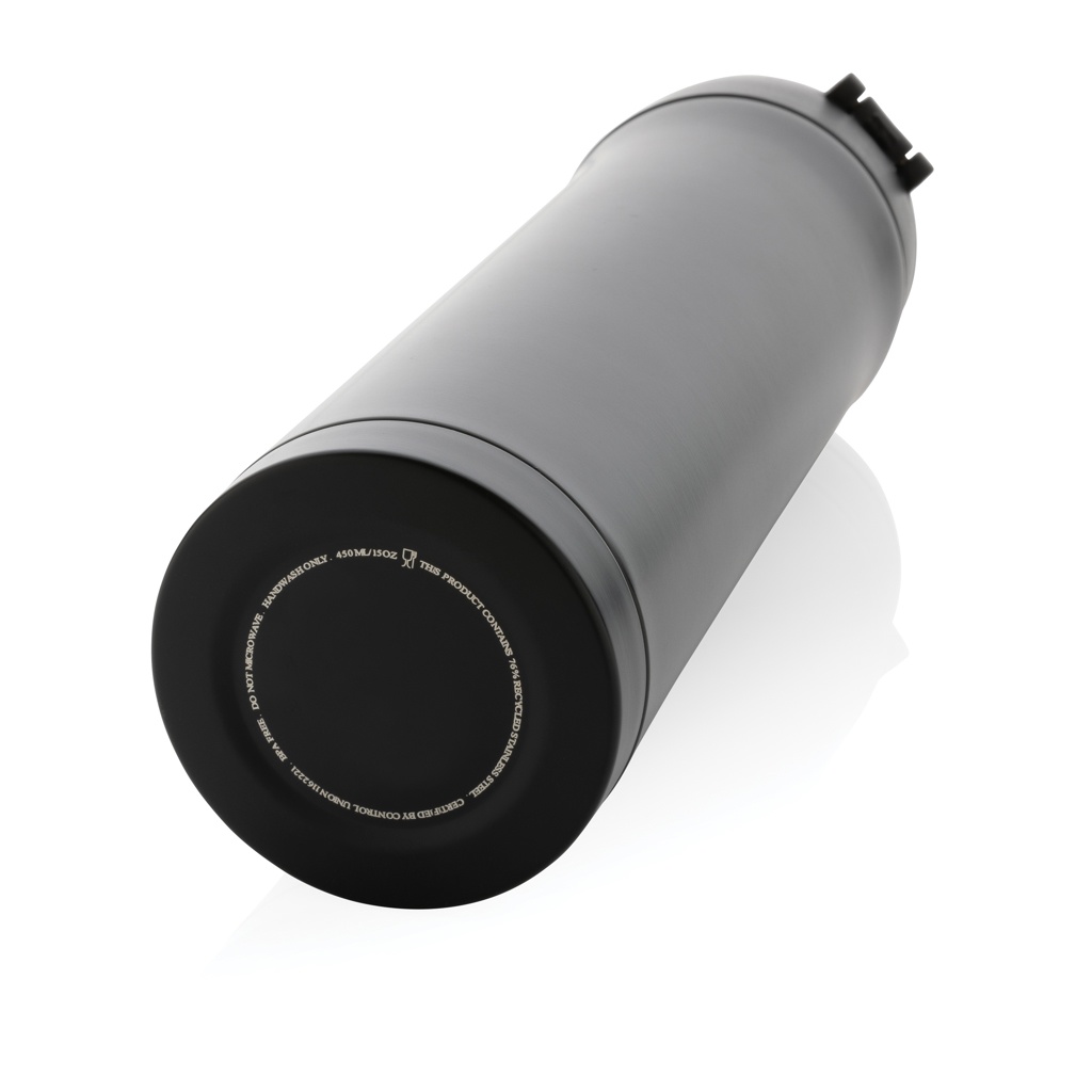 Kaksiseinäinen vakuumipullo ruostumattomasta teräksestä pitää juomat lämpiminä jopa 5 tuntia tai viileänä jopa 15 tuntia. Kansi on lukittavissa ja siksi vuotamaton. Kansi on helppo pitää puhtaana optimaalisen hygienian takaamiseksi ja se voidaan pestä astianpesukoneessa (vain kansi). Pullon ainutlaatuinen muoto mahdollistaa kätevän juomisen yhdellä kädellä suoraan pullosta. Pullo mahtuu lähes kaikkiin autojen juomapidikkeisiin. Valmistettu RCS (Recycled Claim Standard) sertifioiduista kierrätetyistä materiaaleista. Kierrätetyn materiaalin kokonaismäärä: 76% perustuen tuotteen painoon. BPA-vapaa. Tilavuus: 450ml. Sisältää FSC®-sertifioidun kraft-pakkauksen.