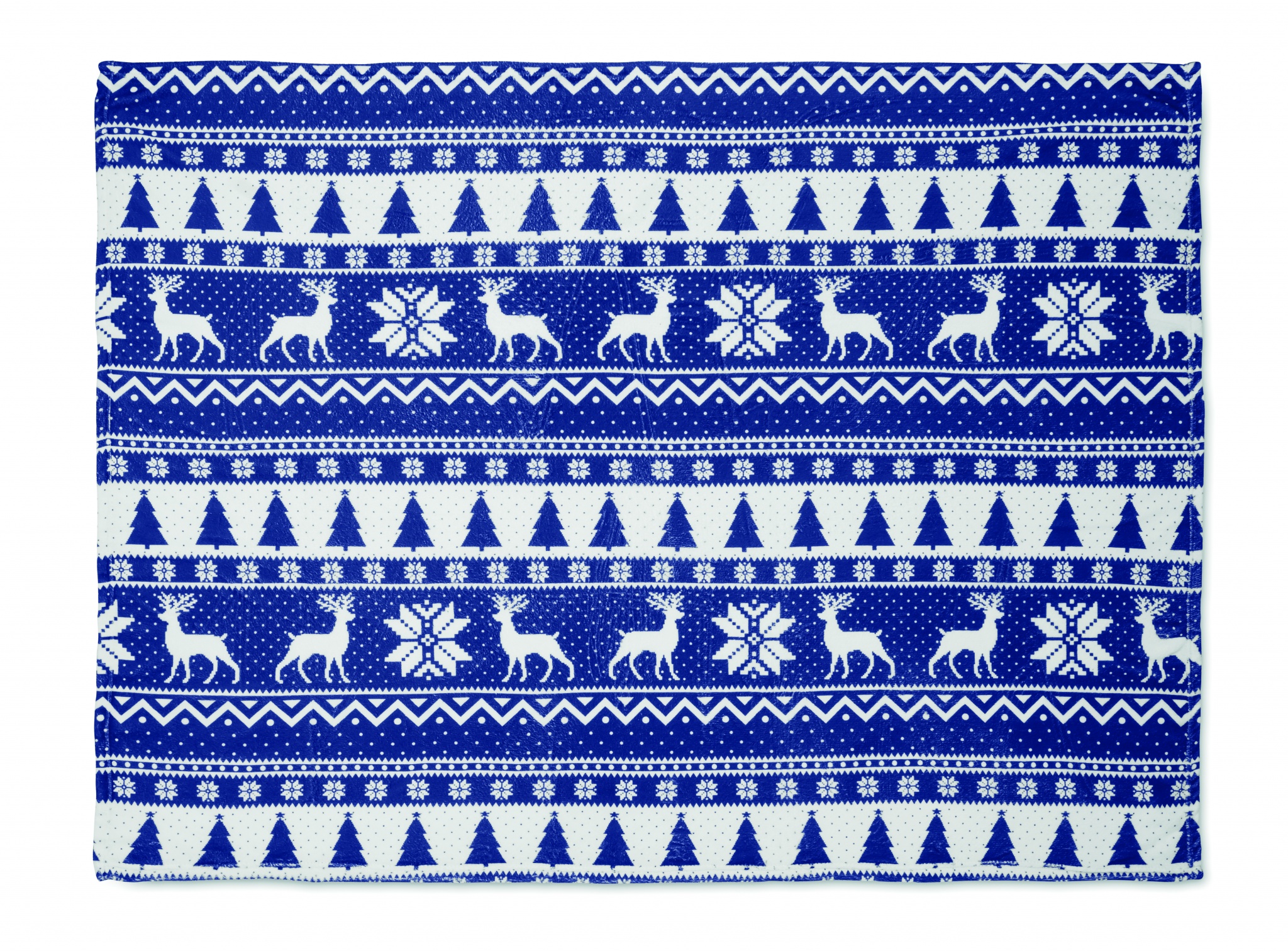 190 gr/m² RPET-korallifleecehuopa, jossa on talvikuvio. Kääritty nauhaan ja tulostettavaan korttiin.