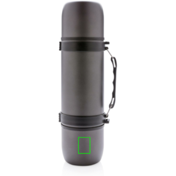 Ruostumattomasta teräksestä valmistettu kaksiseinämäinen termospullo, tyylikäs muotoilu kahvalla ja olkaremmillä. Sisältää kaksi yhteensopivaa kuppia optimaaliseen käyttökokemukseen. Vuototiivis ja vain käsinpesu. Tilavuus 700ml.