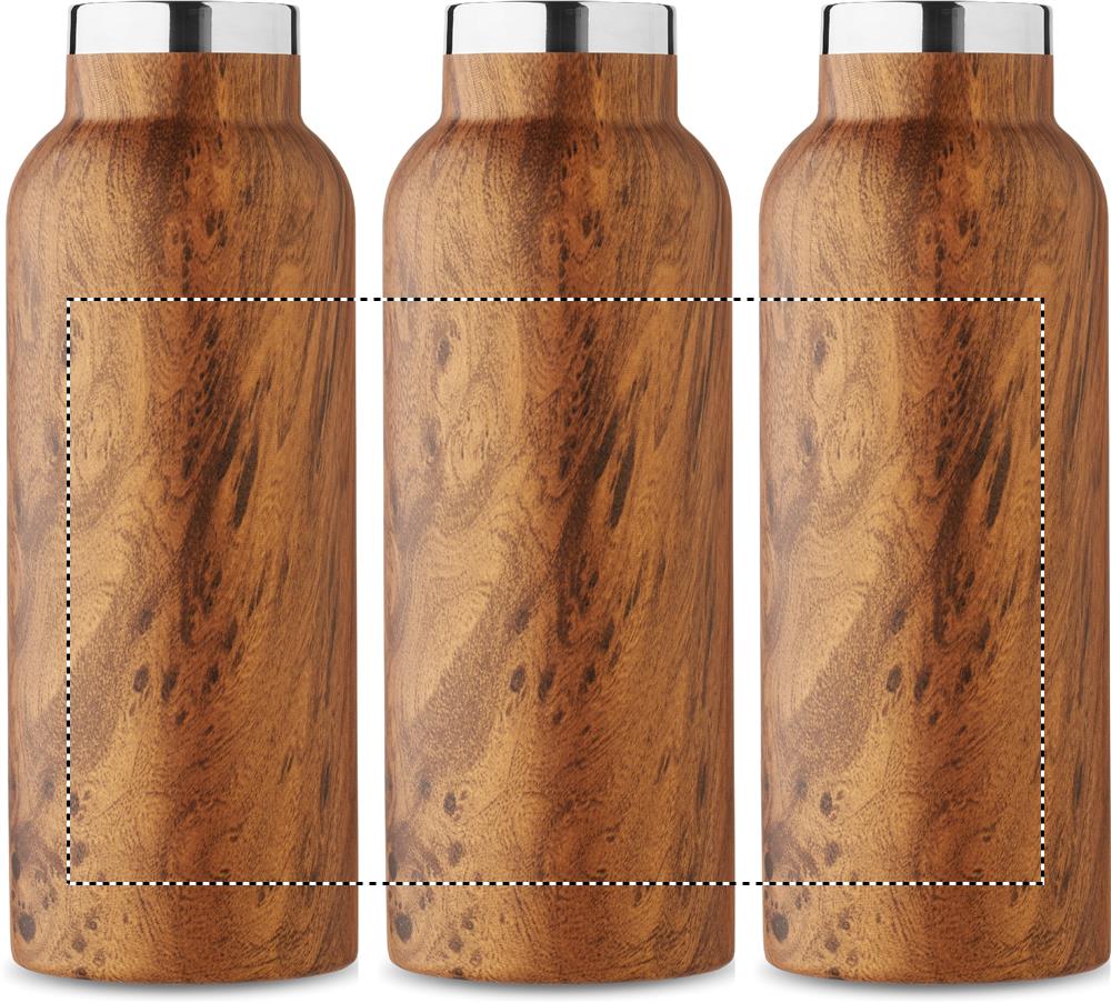 Kaksiseinäinen eristävä tyhjiöpullo kierrätetystä ruostumattomasta teräksestä (90 % kierrätettyä ruostumatonta terästä ja 10 % ruostumatonta terästä). Pullossa puupintaa jäljittelevä pinnoite ja kantokahvainen korkki. Vuotamaton. Tilavuus: 500 ml.