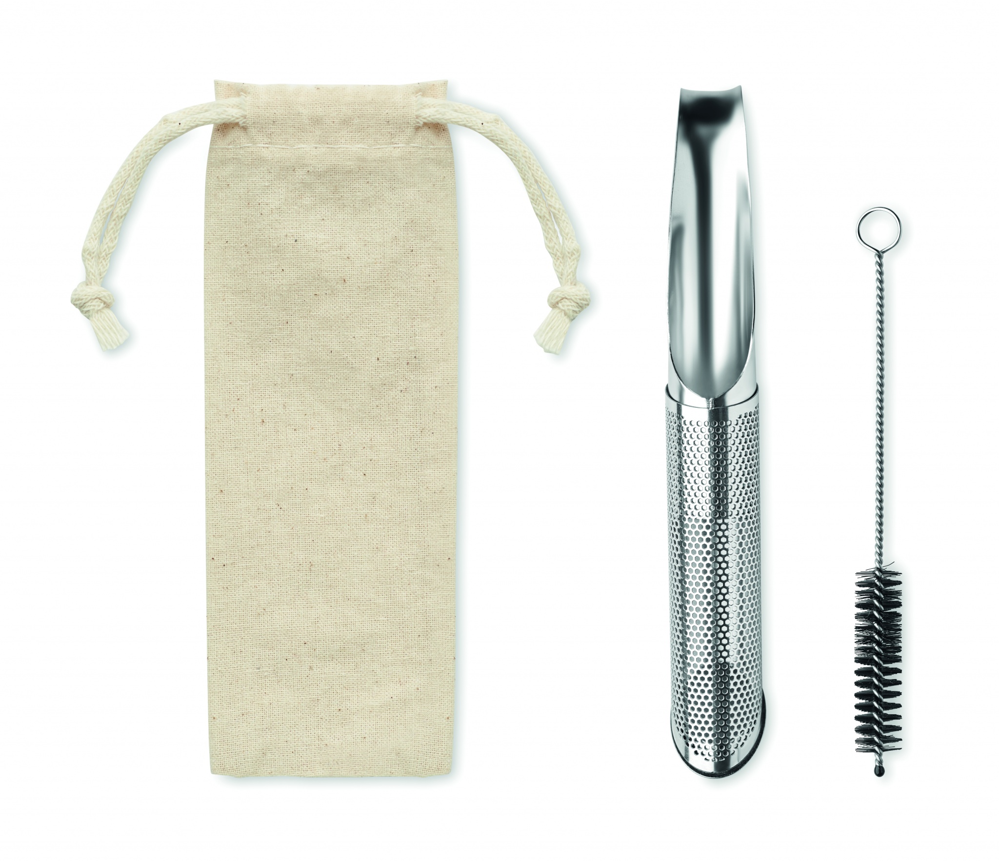 Daugkartinio naudojimo nerūdijančio plieno vamzdžių arbatos infuzijos rinkinys medvilniniame maišelyje. Yra arbatos filtras su kompaktišku ir lenktu užkabinimu, kad jis galėtų kabėti virš puodelio ar puodelio krašto, ir valymo šepetėlis.