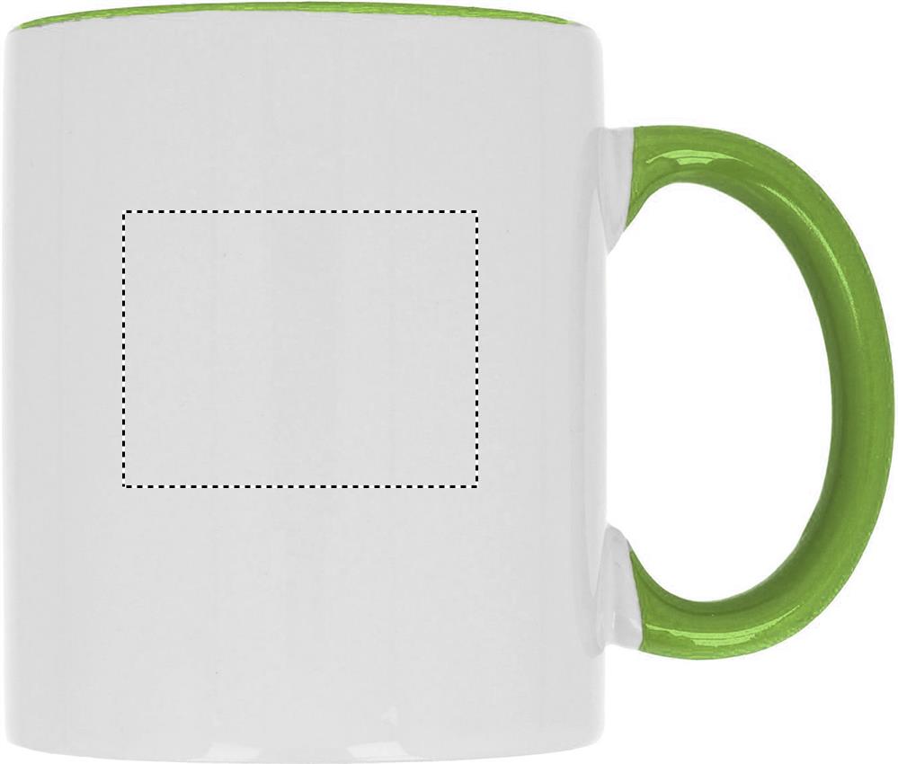Keraminis 300 ml talpos puodelis su specialia danga sublimacijai su spalvota rankena ir vidumi. Individuali pakuotė baltoje kartoninėje dėžutėje.