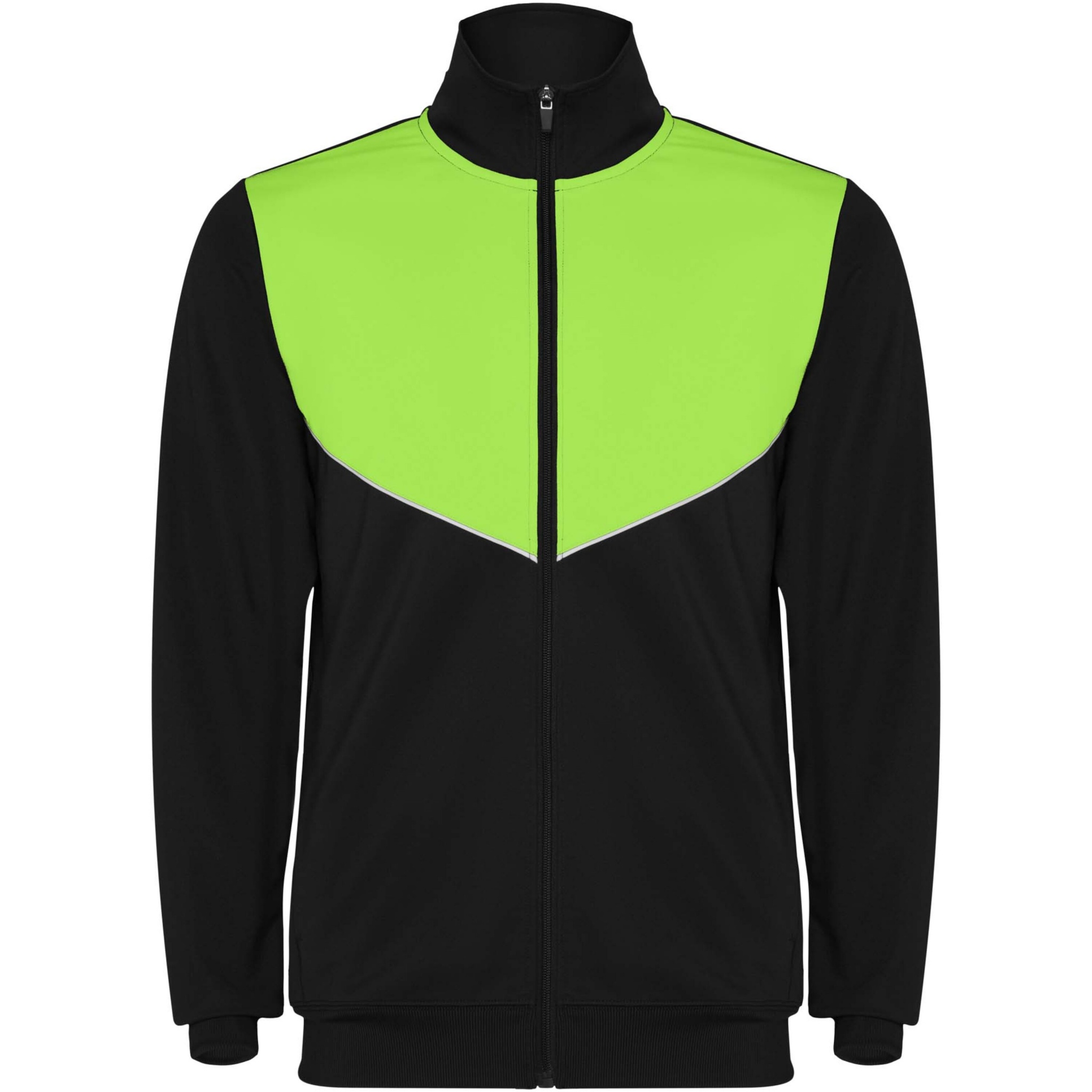 Спортивный костюм из легкой и эластичной ткани. Куртка контрастного цвета с пришивной окантовкой на груди. Высокий воротник с контрастными швами. Центральная молния спереди. Боковые карманы. Манжеты и талия в рубчик 2х2. Брюки с эластичным поясом и кулиской. Контрастная боковая часть с пришивной отделкой. Застежка-молния по краю.