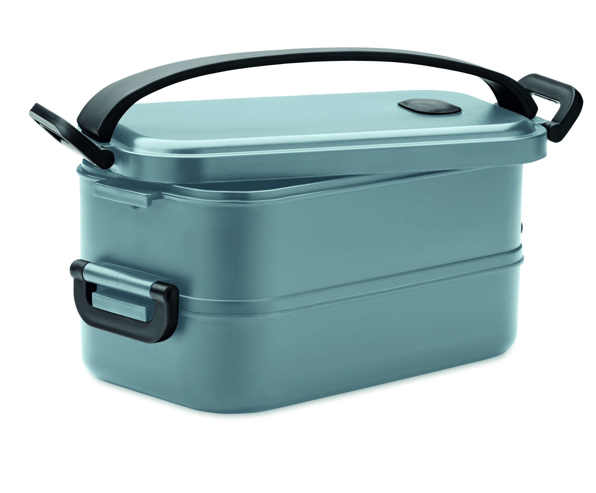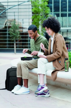Двухуровневый ланч-бокс из переработанного полипропилена со съемным разделителем и боковыми застежками, герметичная крышка. Вместимость: 800 мл (1 уровень).