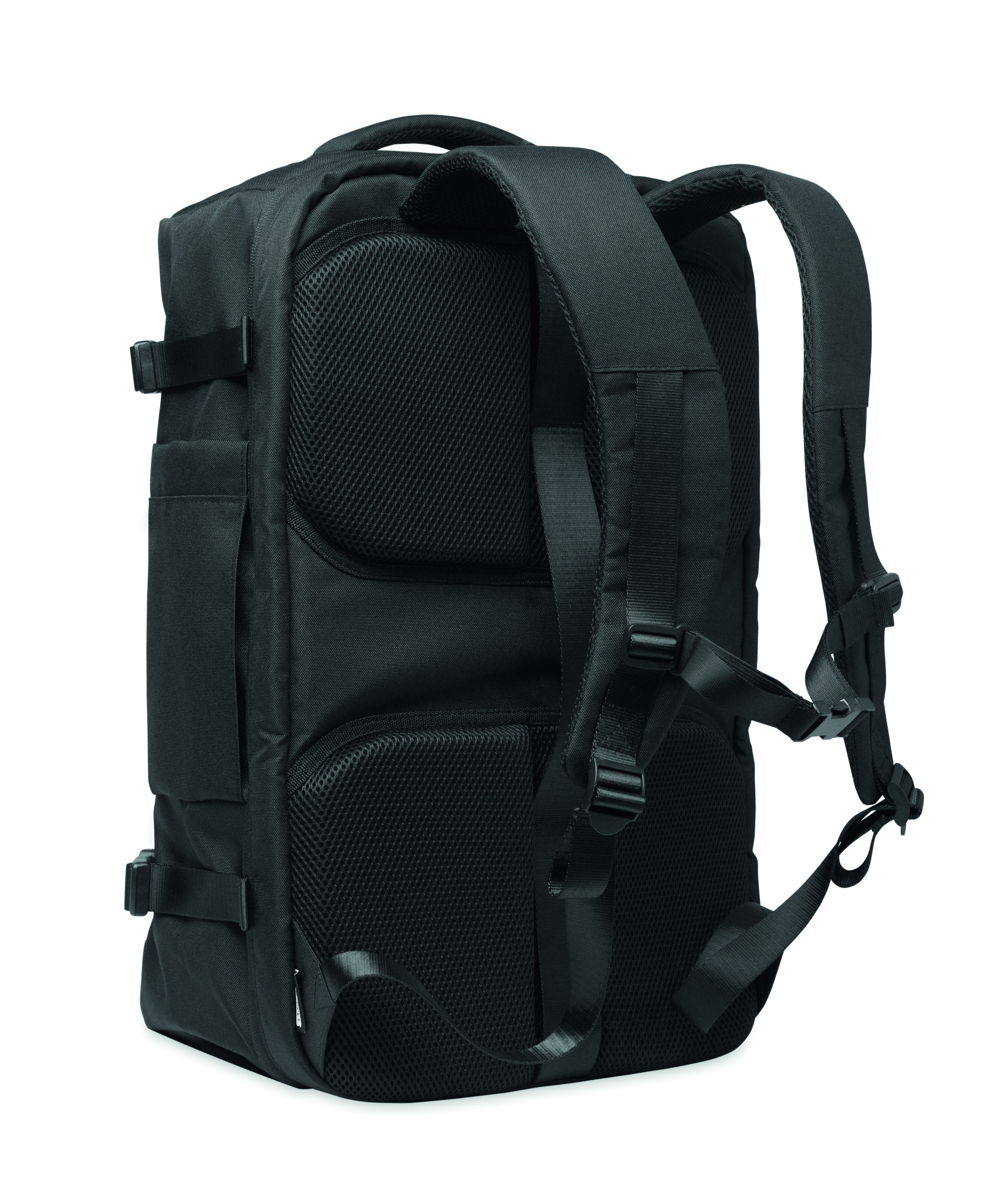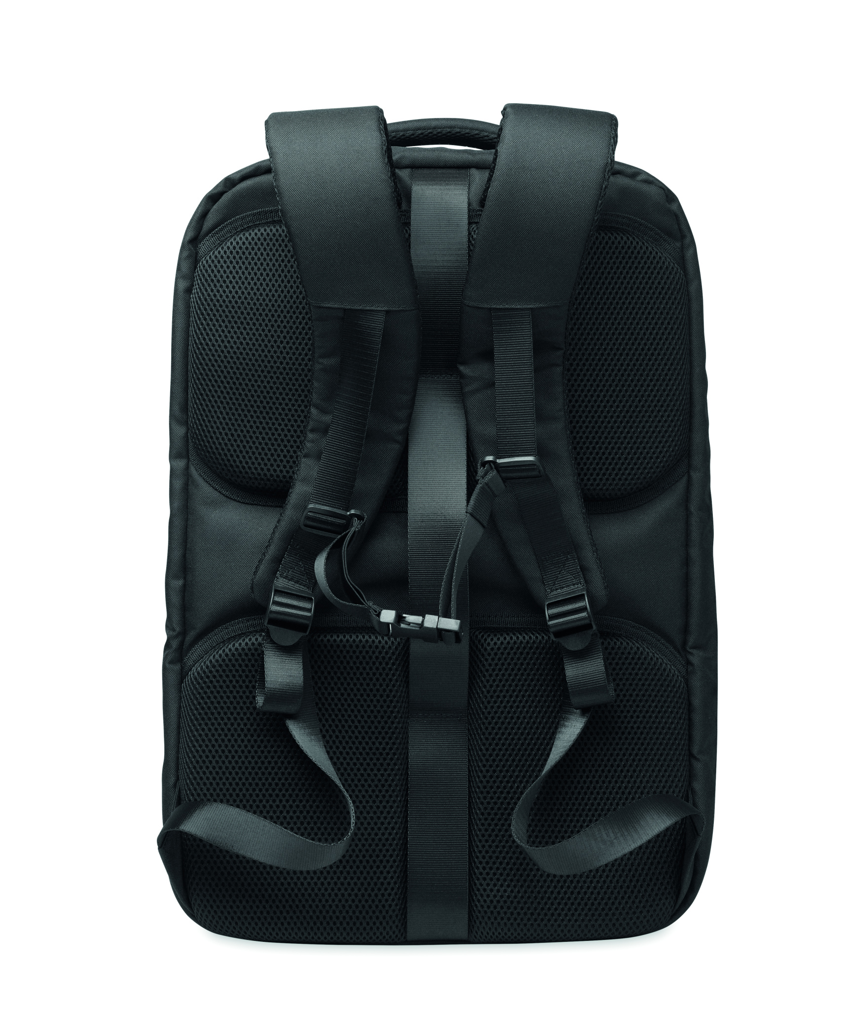 Large travel 17 inch laptop backpack in 600D RPET polyester. Features several compartments as one main for clothes, two padded for laptop, tablet and more. Padded back panel, shoulder strap, hand grip.