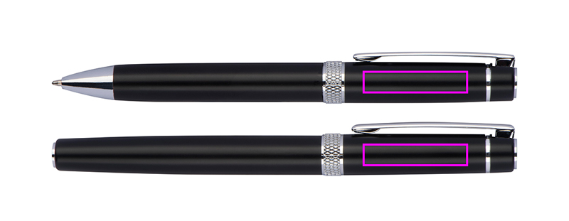 Набор для письма, состоящий из шариковой ручки с поворотным механизмом и синим стержнем для системы письма и синей ручки-роллера из алюминия в футляре. Хромированные аппликации и сверкающие декоративные кольца придают набору элегантный вид. Ваш логотип будет выгравирован на обеих ручках справа от зажима.