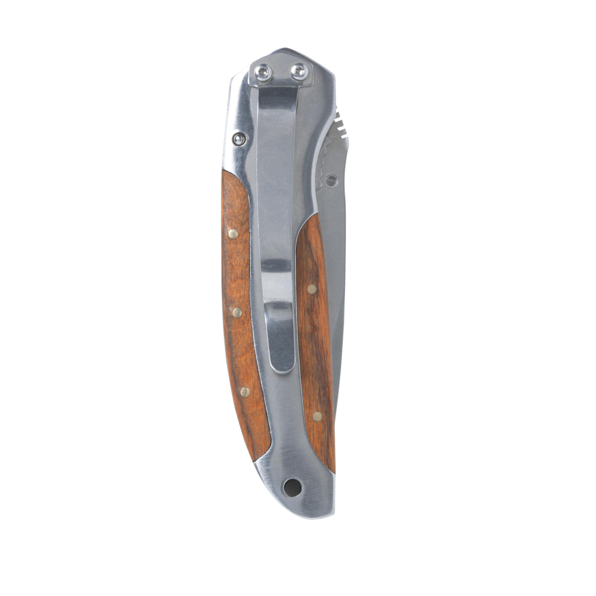 Прочный нож для выживания из нержавеющей стали с зубчатым лезвием, деревянной вставкой в рукоятке и удобным зажимом. Обратите внимание, что могут применяться местные правила относительно владения и/или ношения ножей или мультитулов в общественных местах. Каждый предмет поставляется в индивидуальной коричневой картонной коробке.