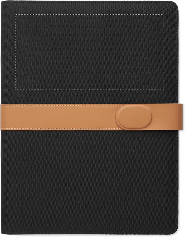 Папка А4 из RPET с деталями из искусственной кожи. Сменный блокнот формата А4. 30 линованных страниц из переработанной бумаги. Держатель для ручки. 4 держателя для визиток, 3 маленьких кармана и одно большое отделение. Ремешок с магнитной застежкой