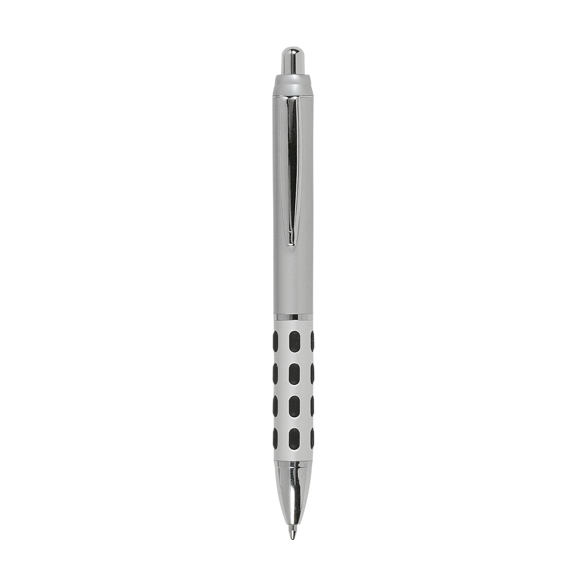 Шариковая ручка с синими чернилами, алюминиевой рукояткой и цветными резиновыми деталями.