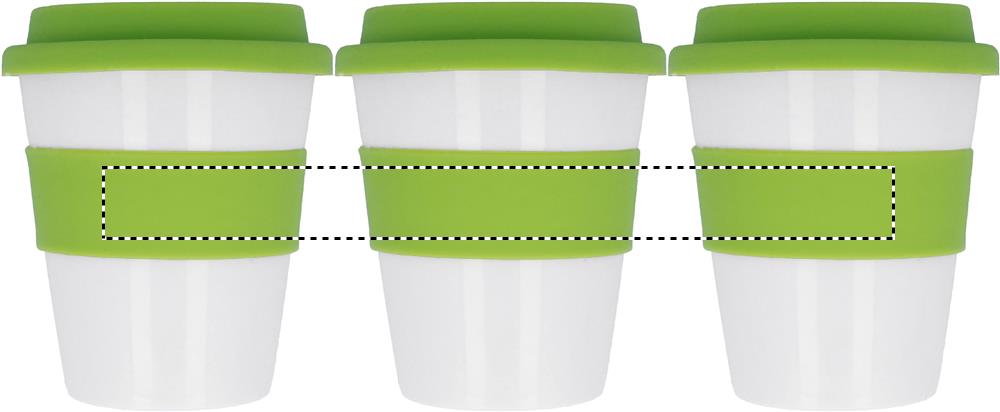 Одностенчатый стакан из блестящего белого полипропилена с силиконовой крышкой и ободком. Емкость 350мл. Поскольку это одностенчатое изделие, осторожно - может нагреваться!