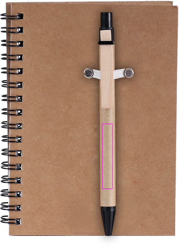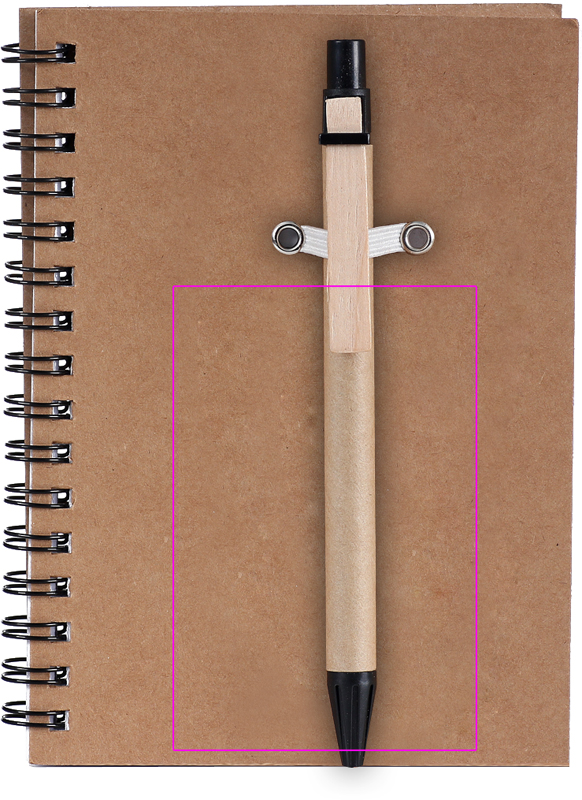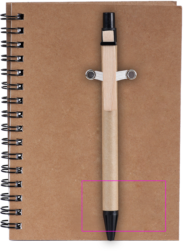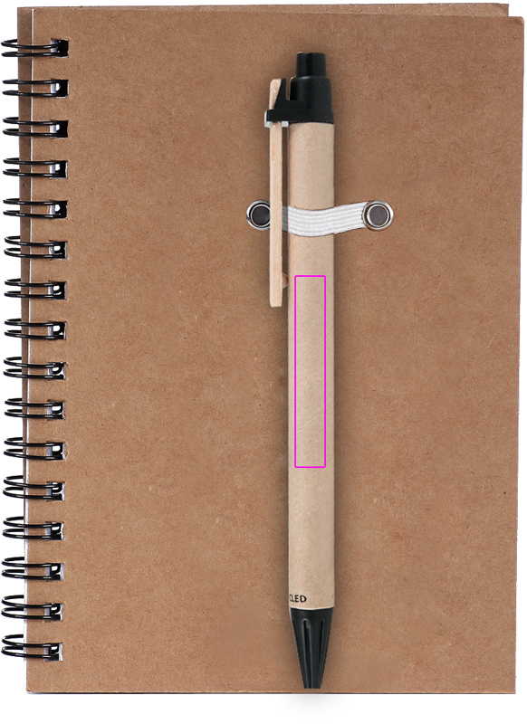 Anteckningsblock av återvunnen kartong med 120 sidor återvunnet papper och en kulspetspenna med blått bläck. Vi trycker din logotyp på omslaget.