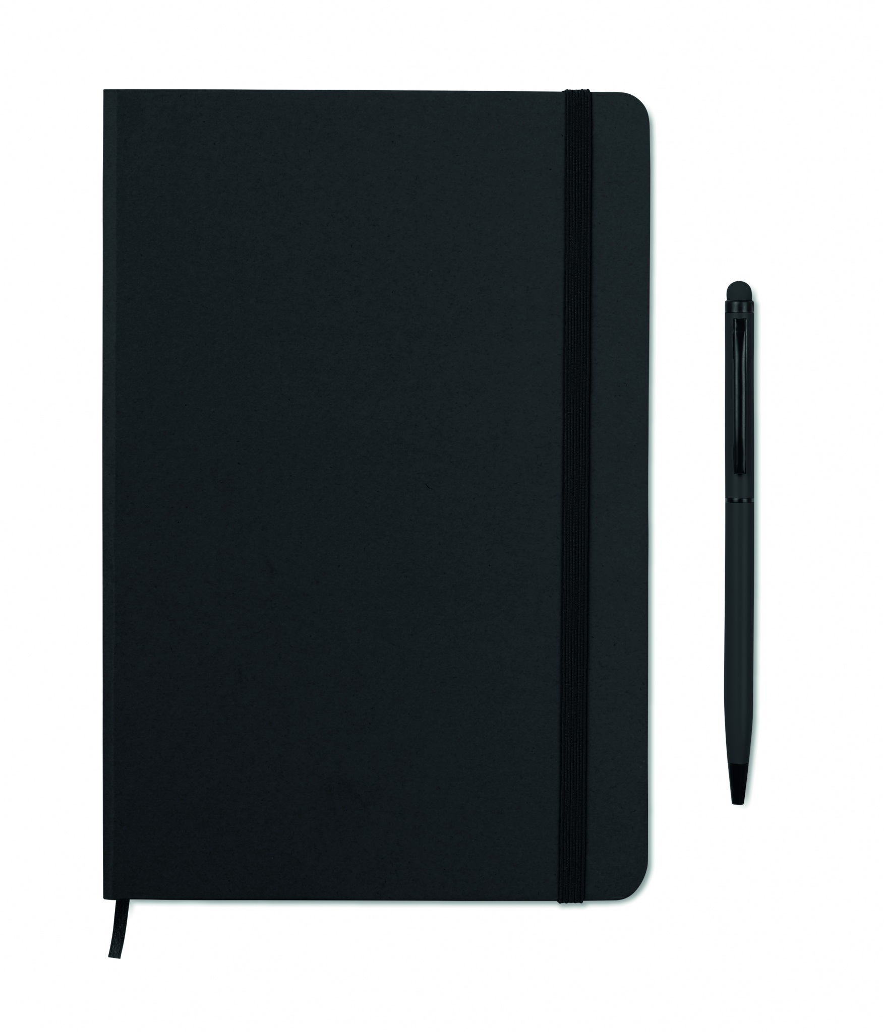 Anteckningsbok i A5 med hård pärm med gummerad känsla, 72sidor, bokmärkesband i satin och gummibandsförslutning. inkl. matallpenna av twistmodell i matchande färg med blått bläck.