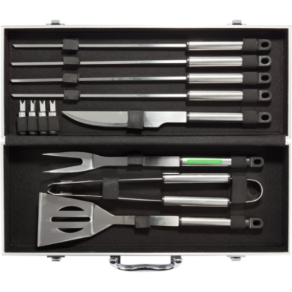BBQ-set i stainless steel, 12 delar. Allt förpackat i en snygg aluminiumlåda.
