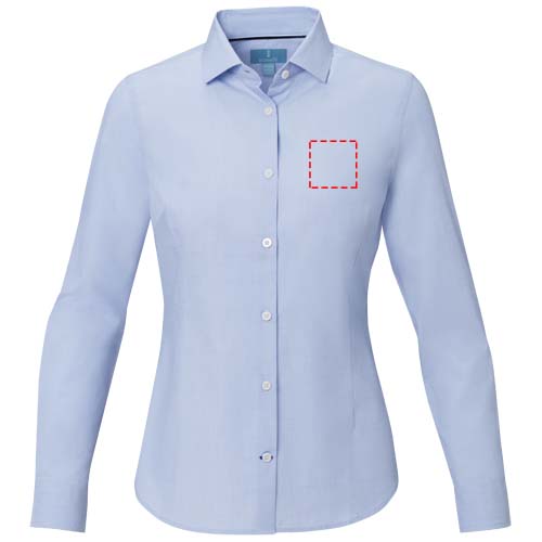 Cuprite långärmad ekologisk skjorta för dam - ett hållbart och snyggt val. Skjortan är tillverkad av ekologisk bomullspoplin och kombinerar etisk tillverkning med exceptionell komfort. Den har en semi-spread krage som ger en mer avslappnad och mångsidig look. De kontrastfärgade sömmarna på ärmsluten och knapphålssluten nedtill ger skjortan en diskret stil. Skjortan är designad med en figurnära passform för en feminin look.
