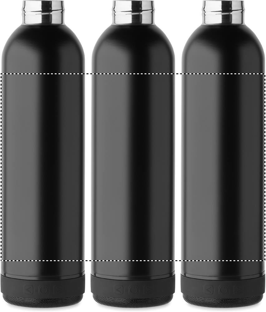 Dubbelväggig vakuumisolerande flaska i återvunnet rostfritt stål (90% återvunnet rostfritt stål och 10% rostfritt stål) och silikonbärhandtag med löstagbar 3W trådlös högtalare. Volym: 500 ml. 500 mAh batteri. Ta bort högtalaren vid rengöring. Läckagefri.