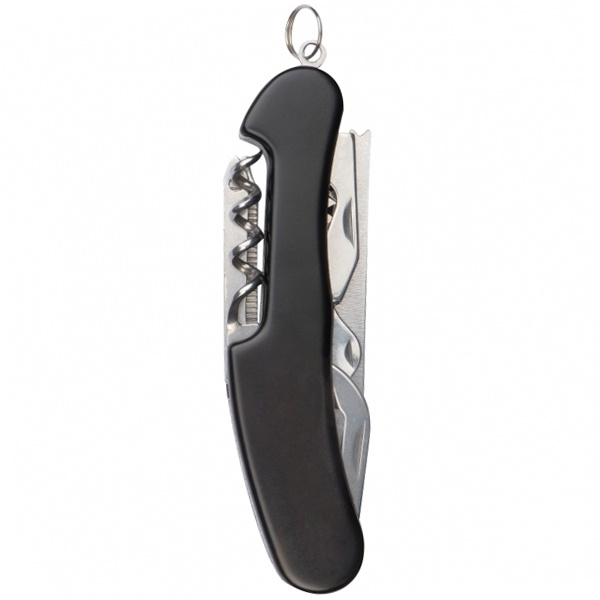 14-delad fickkniv av rostfritt stål bestående av: konservöppnare, sax, fiskkrokborttagare, fiskfjäll, sågkniv, kniv, spårskruvmejsel, konservöppnare, nyckelring, korkskruv, nagelfil, brotsch och stjärnskruvmejsel. Vi graverar din logotyp på kniven.