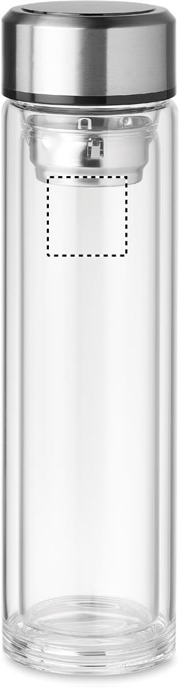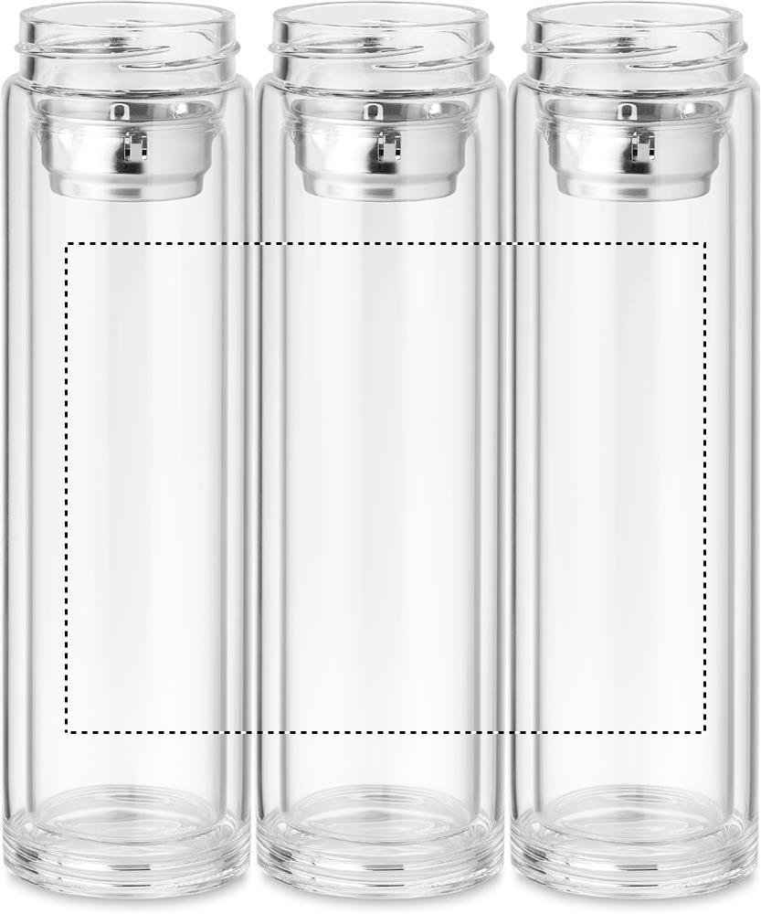 Glas flaska med dubbelvägg i Boroisilikat glas. Borosilikatglas klarar stora tempraturskillnader utan att spricka och lämpar sig väl både för varma och kalla drycker. levereras med LED touchtermometer infälld i locket för att se temperaturen på insidan. Drivs av ett 1 utbytbart CR2032-batteri ingår. Volym: 390 ml. Läckagefritt.